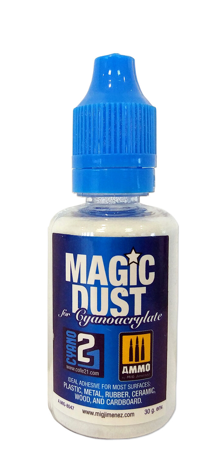 Mit diesem Pulver können Sie Cyanacrylatverbindungen stärken und verstärken. Es kann auch als Kitt verwendet werden, um Lücken zu füllen. Dieses vielseitige Produkt ist einfach zu bedienen und verfügt über einen Spender für eine präzise Anwendung. Tragen Sie das Produkt einfach auf das Cyanacrylat auf, um die Aushärtezeit zu verkürzen. Der Auftragsprozess kann umgekehrt werden: Tragen Sie zuerst Magicdust 21 und dann den CA-Kleber auf und lassen Sie das Produkt ca. 5 Minuten aushärten. Überschüssiges Material kann dann abgeschliffen werden, die feste Oberfläche kann auch graviert werden.