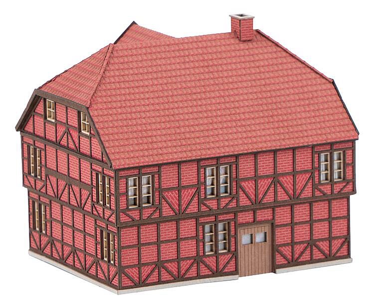 Baudenkmal! Originalgetreues Lasercut-Modell der 1694 errichteten Eutiner Hofapotheke in Schleswig-Holstein. Der zweistöckige Fachwerkbau mit Rotsteinausfachung, großem Giebel und einem Krüppelwalmdach dient heute als Bürogebäude.