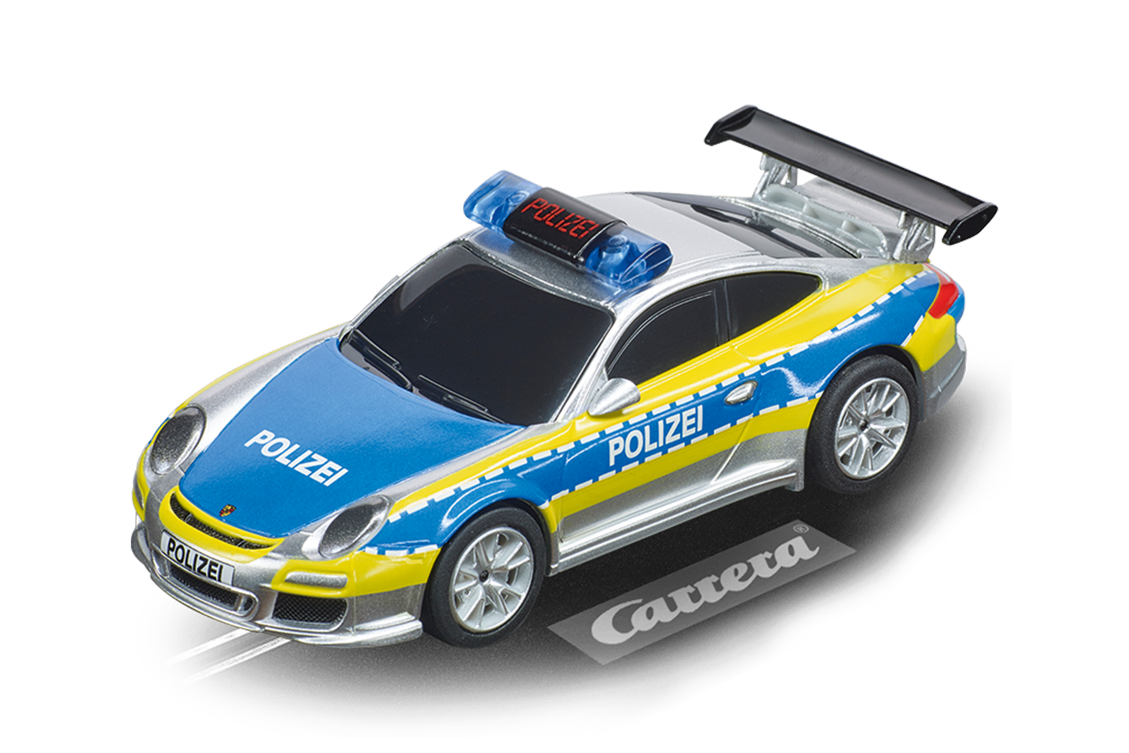 Porsche Feeling für Zuhause Der Porsche 911 ist ein echter Klassiker. Das schnitte Fahrzeug begeistert Autofans schon seit Generationen und kann nicht nur mit einer hochwertigen Ausstattung, sondern auch mit ordentlich Tempo glänzen. Seit der Porsche 911 im Jahr 1963 das erste Mal in Stuttgart vom Band rollte, wird das beliebte Modell kontinuierlich weiterentwickelt. Doch nicht nur als Straßenwagen ist der Flitzer beliebt, sein Renndebüt feierte er 1965 bei der Rally Monte Carlo und konnte danach weiter in zahlreichen Rennen glänzen. Schneller, als die Polizei erlaubt Mit dem Carrera GO!!! Porsche 911 „Polizei“ machst Du im Rennen auf der Wohnzimmerpiste ordentlich Tempo. Das schnittige Modell vereint das Beste des klassischen Designs des Porsche 911 mit schicker Polizei-Lackierung in Silber und Blau mit neongelben Highlights. Dadurch glänzt Du nicht nur mit deiner Leistung im Rennen, sondern auch im optischen Duell mit Freunden. Außerdem ist der Porsche stilecht mit einem blinkenden Blaulicht ausgestattet.