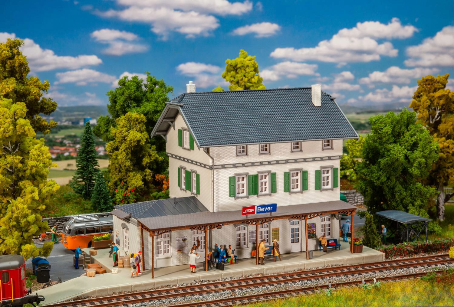 Schmuckstück der Albulalinie. Modell des dreigeschossigen Stationsgebäudes »Bever« mit weißer Ziegelfassade im Erdgeschoss, mit weißen Schindeln verkleideten Obergeschossen und einem mit Ziegeln bedeckten, hervorkragenden Krüppelwalmdach. Als Fundament des Modells dient ein Sockel mit Stufen, Rampe und Bahnsteig. Die Albulabahn im Schweizer Kanton Graubünden verbindet Thusis am Hinterrhein mit dem Kurort St. Moritz im Engadin.