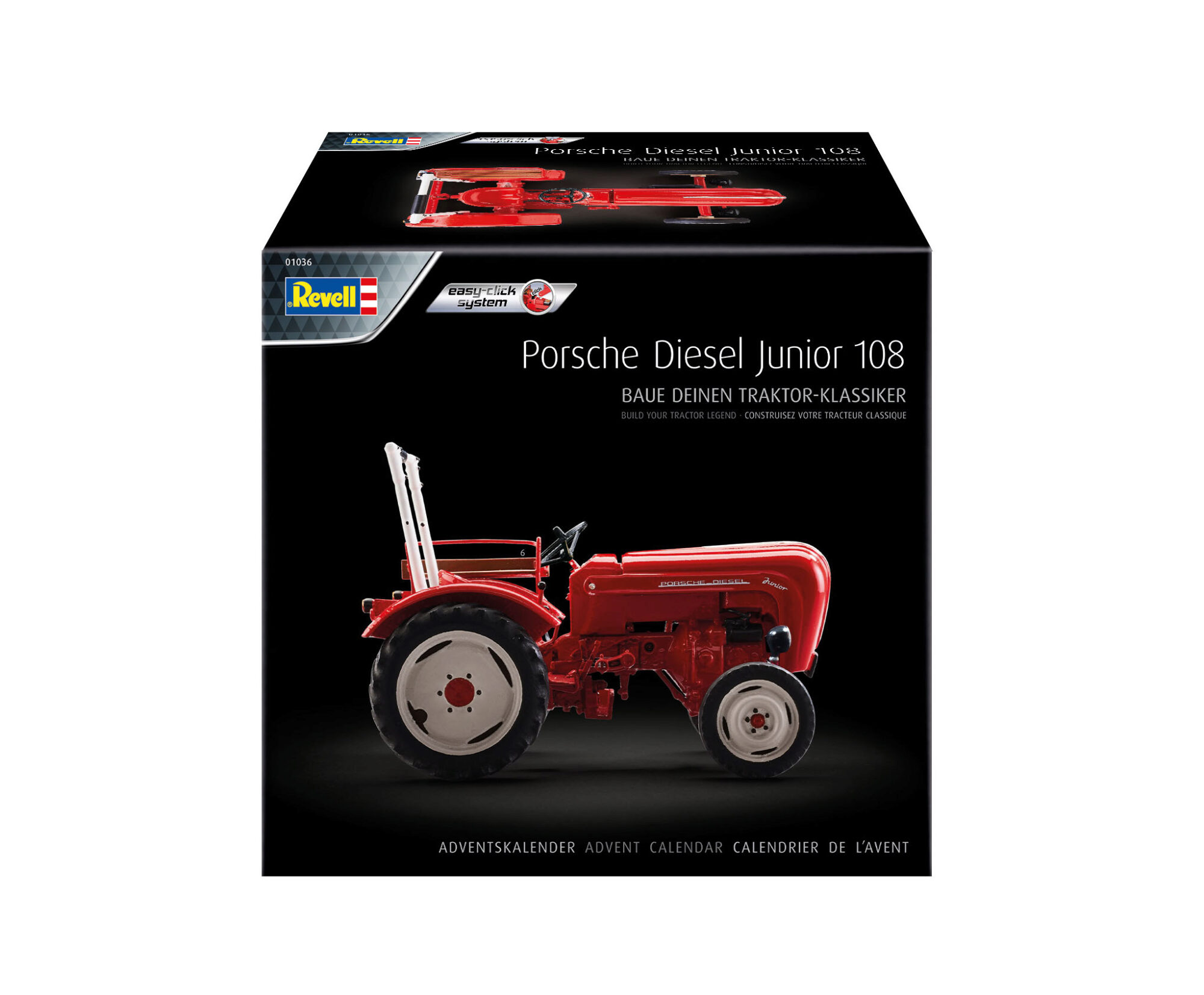 Der legendäre, robuste Porsche Junior 108 wurde von der Porsche-Diesel Motorenbau GmbH ab den späten 1950er Jahren gefertigt. Mit diesem Adventskalender baust du dir den Traktorklassiker jetzt selbst. Alles was du dazu benötigst ist in den 24 Türchen enthalten und an Weihnachten steht dein Porsche Junior 108 unter dem Weihnachtsbaum. • easy-click Bausatz des Porsche Junior 108 • Mehrfarbige Teile. Kein Kleben. Kein Bemalen • Stickerbogen • Bauanleitung • 5 Aqua Color-Farben für die optionale Detailbemalung • Pinsel • Seitenschneider • Sandblattfeile • Modellbaumesser Durch das innovative easy-click-system ist bei diesem Modell schneller Erfolg garantiert: Mehrfarbige, präzise gefertigte Bauteile werden durch einfaches Zusammenstecken stabil verbunden und mit Stickern dekoriert. Altersempfehlung 10+ Einzelteile: 76 Länge: 10,7 cm Breite: 6,1 cm Höhe: 7,9 cm