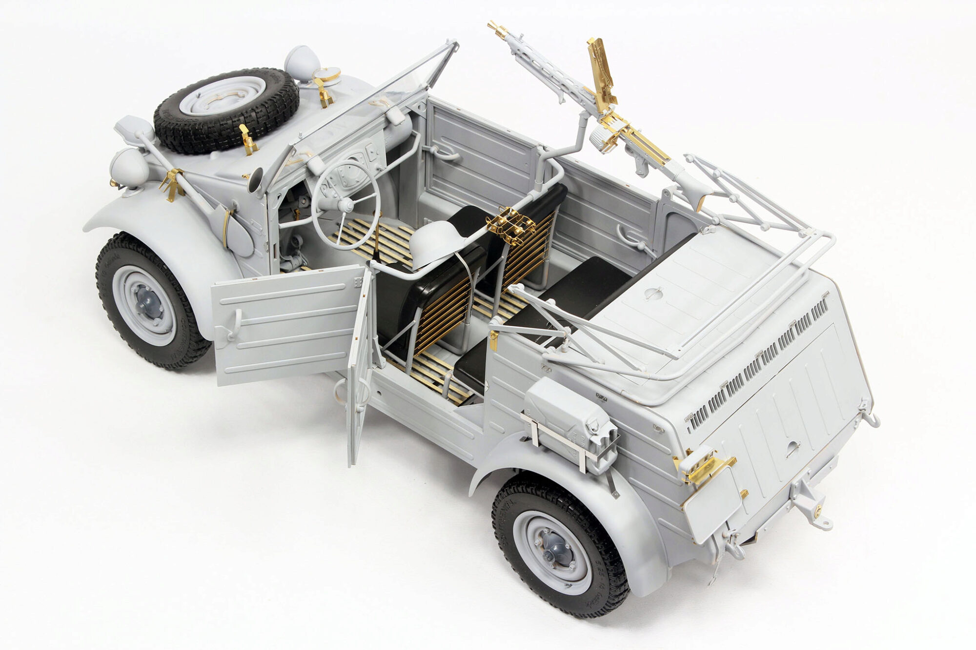 Modellbausatz des Typ 82, besser bekannt als Kübelwagen. Dieser war der Geländewagen schlechthin der Wehrmacht. Kübelwagen kamen auf allen Schlachtfeldern zum Einsatz und waren aufgrund ihrer Robustheit allen klimatischen Bedingung gewachsen. Der Großmaßstab 1:9 ermöglicht bereits eine sehr hohe Detaillierung des Kübelwagens, die mit den im Bausatz enthaltenen Fotoätzteilen noch weiter gesteigert werden kann. · Zu öffnendes Verdeck · Sehr detaillierter Motor · Stoffverdeck · Lenkbare Vorderachse · Gummireifen · Fotoätzteile • Limitierte Auflage Authentische Darstellung folgender Versionen: