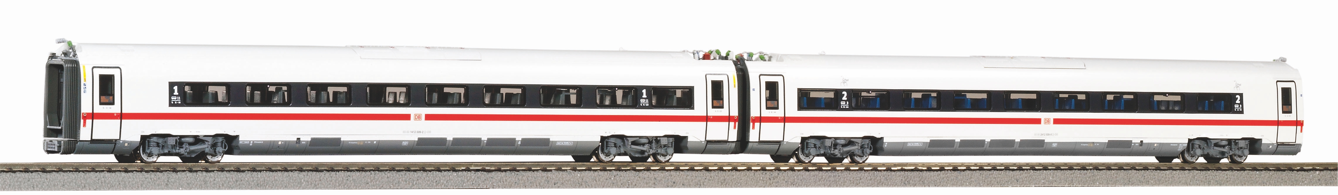 Neuheit 2021: 2er Set Ergänzungswagen zum PIKO ICE 4 der DB AG Ep. VI. Die Deutsche Bahn AG beauftragte 2011 Siemens Mobility mit dem Bau von bis zu 300 neuen Hochgeschwindigkeitszügen für den Einsatz in Deutschland, Österreich und der Schweiz. Die neuen Triebzüge der BR 412/812, die gemeinsam von Siemens und Bombardier entwickelt werden, werden über mehrere Wagen, sogenannte Powercars, angetrieben. Die Zugkonfiguration sieht hierbei verschiedene modular aufgebaute Einheiten von fünfteiligen bis zu 14teiligen Zügen vor. Durch dieses Konzept kann der Zug problemlos an die individuellen Vorgaben der Verkehrsunternehmen bei der gewünschten Beschleunigung, Geschwindigkeit und Zahl der Sitzplätze angepasst werden. Die DB hat bisher als Basiskonfiguration85 zwölf- und 45 siebenteilige Triebzüge bestellt, die aus antriebslosen End- bzw. Steuerwagen, angetriebenen Sitzwagen und Bordbistro sowie nichtangetriebenen Sitz-, Speise- und Servicewagen bestehen.Der siebenteilige Triebzug besitzt drei angetriebenen Wagen und bietet 456 Sitzplätze auf einer Länge von 200 Metern. Ein zwölfteiliger Triebzug verfügt über sechs angetriebene Wagen und 830 Sitzplätze auf einer Länge von 346 Metern. Die Höchstgeschwindigkeit beträgt mit 250 km/h. Die äußere Form wurde an die bestehende ICE-Flotte angelehnt und weiterentwickelt. Seit Dezember 2017 werden die ersten Züge im Regelbetrieb auf den Linien Hamburg–Würzburg, Stuttgart–München und Hamburg–Berlin–München eingesetzt.