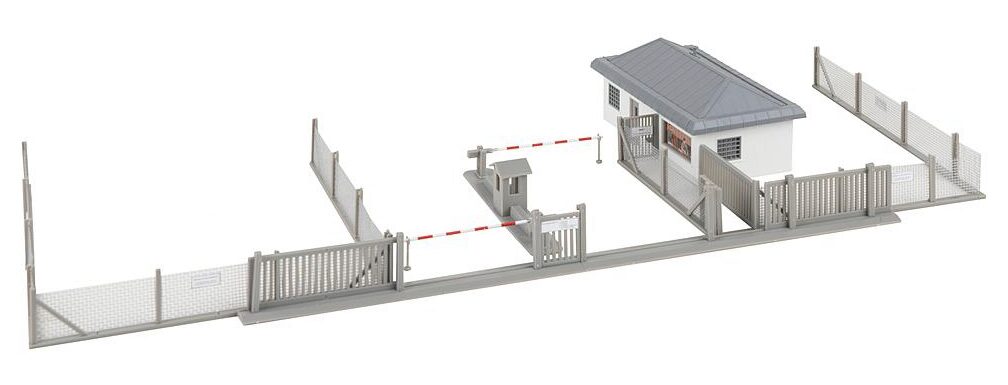 Ein umzäuntes Wachgebäude mit Schiebe- und Eingangstor, Schlagbäumen, Schranken und Fahnen ergänzt den Eingangsbereich einer Kaserne nicht nur dekorativ, sondern belebt zusätzlich auch die Modellbauanlage.