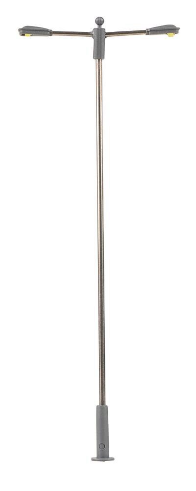 Moderne, zweiflammige Ansatzleuchte. Besonders geeignet zur Ausgestaltung von Stadt-, Straßen- und Industrieszenerien. Der Mast ist aus Metall gefertigt und die Leuchtenhöhe variabel einstellbar. Ausgestattet mit langlebiger LED-Technik. Höhe: 93 mm.