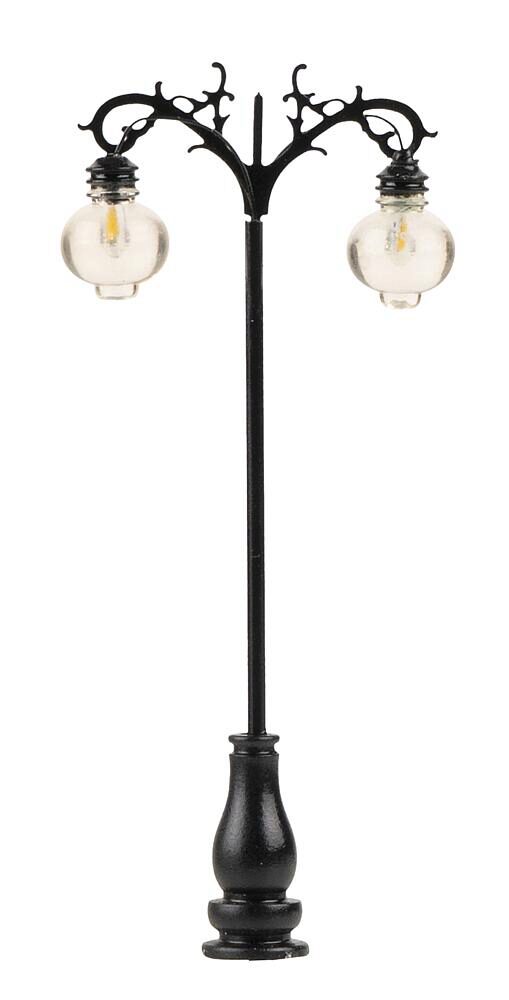 Modell einer historischen, schmiedeeisernen Hängeleuchte. Die filigran ausgeführten Verzierungen verleihen dieser Leuchte besonderen Charme. Damit eignet sie sich im besonderen Maße zur Beleuchtung von Altstädten, Parks und historischen Szenerien. Der Mast ist aus Metall gefertigt und die Leuchtenhöhe variabel einstellbar. Die zweiflammige Hängeleuchte ist mit langlebiger LED-Technik ausgestattet. Höhe: 75 mm.