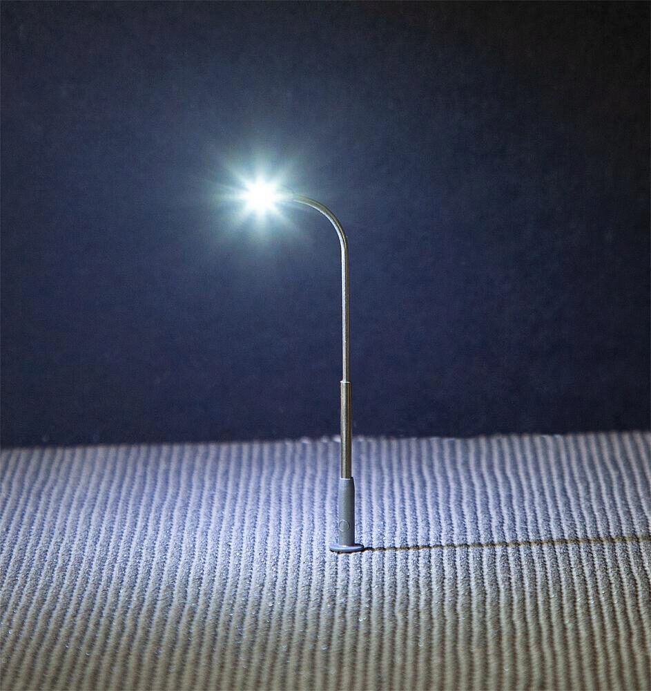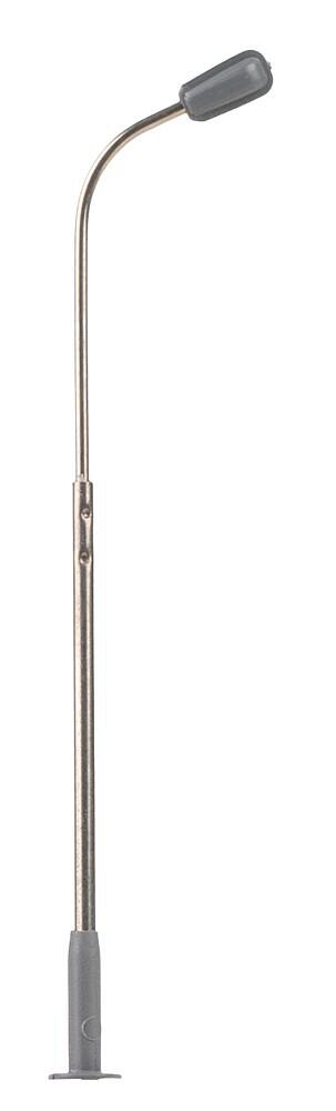 Moderne und weitverbreitete Peitschenleuchte. Besonders geeignet zur Ausgestaltung von Stadt-, Straßen- und Industrieszenerien. Der Mast ist aus Metall gefertigt und die Leuchtenhöhe variabel einstellbar. Die filigrane einflammige Leuchte ist mit langlebiger LED-Technik ausgestattet. Höhe: 65 mm.