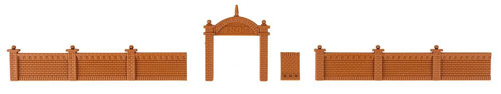 Geziegelte Fabrikmauer mit Friesen und einem gemauerten Rundbogen als Einfahrtstor.