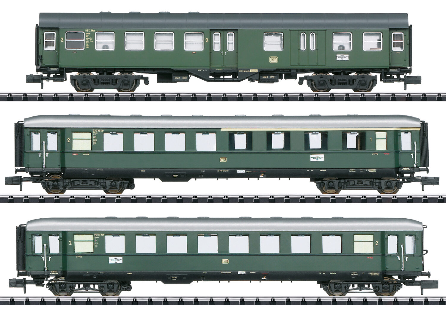 Vorbild: 1 Umbauwagen BPw4yg, 1 Eilzugwagen 1./2. Klasse windschnittiger Bauart AB4yse und 1 Eilzugwagen 2. Klasse windschnittiger Bauart B4ylwe im Zustand um 1959 der Deutschen Bundesbahn (DB) in flaschengrüner Farbgebung