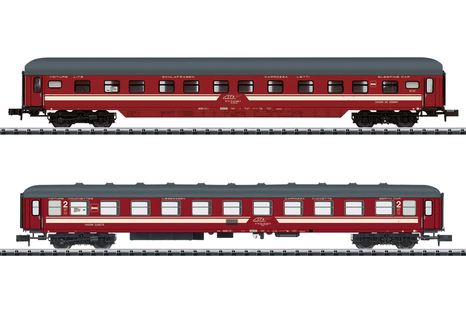 Vorbild: 1 Schnellzugschlafwagen WLABmee und 1 Liegewagen Bcm der Căile Ferate Române (CFR). Einsatz: Hochwertiger Fernverkehr, hier im EC Venezia um 2009