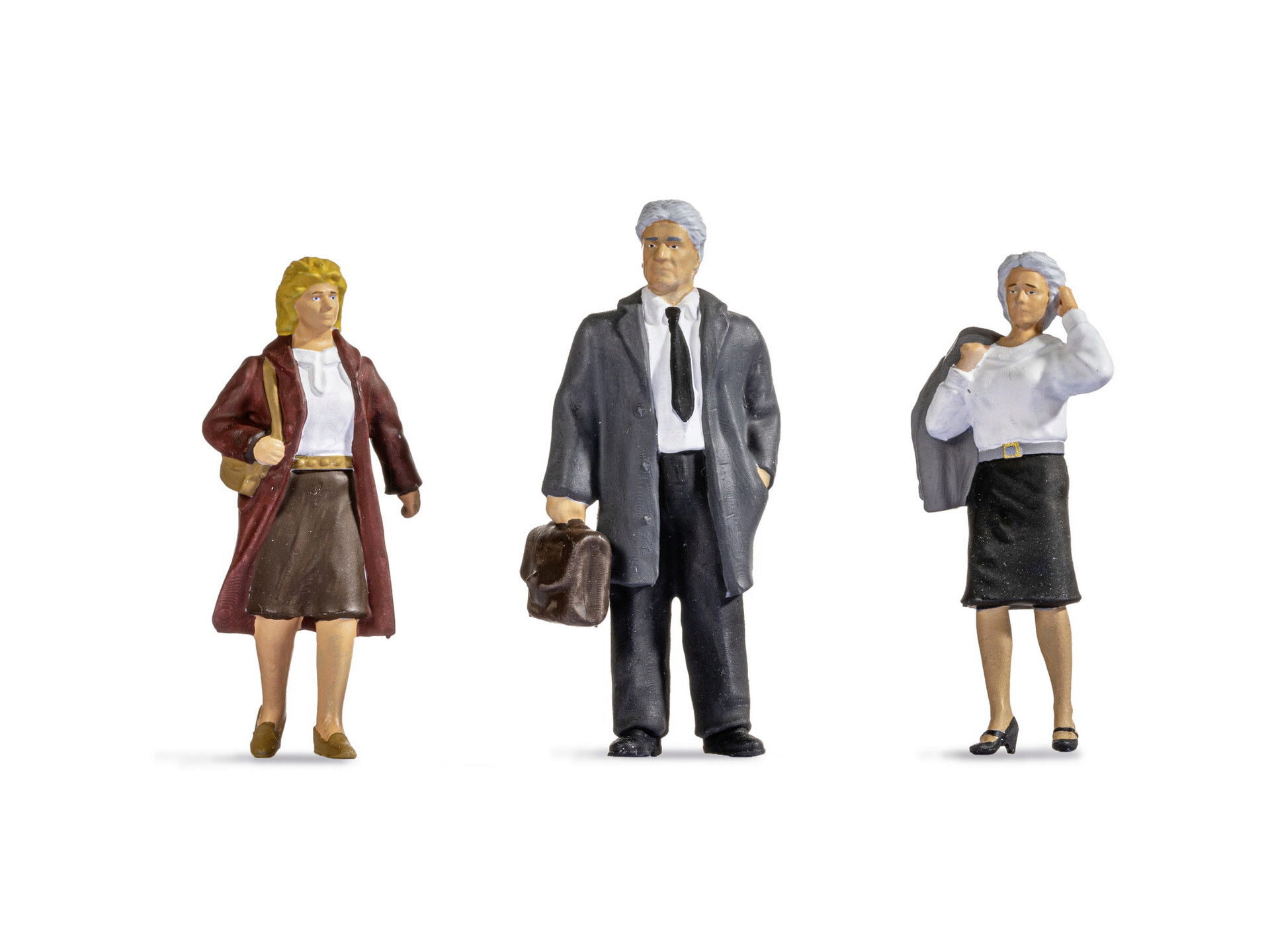 Im Figuren-Set sind 3 Figuren, die alle handbemalt sind, enthalten. Sie alle sind auf Reisen und eine Person hält eine braune Reisetasche in der Hand. Die Figuren sind alle schick gekleidet und warten auf die Weiterreise am Bahnhof.
