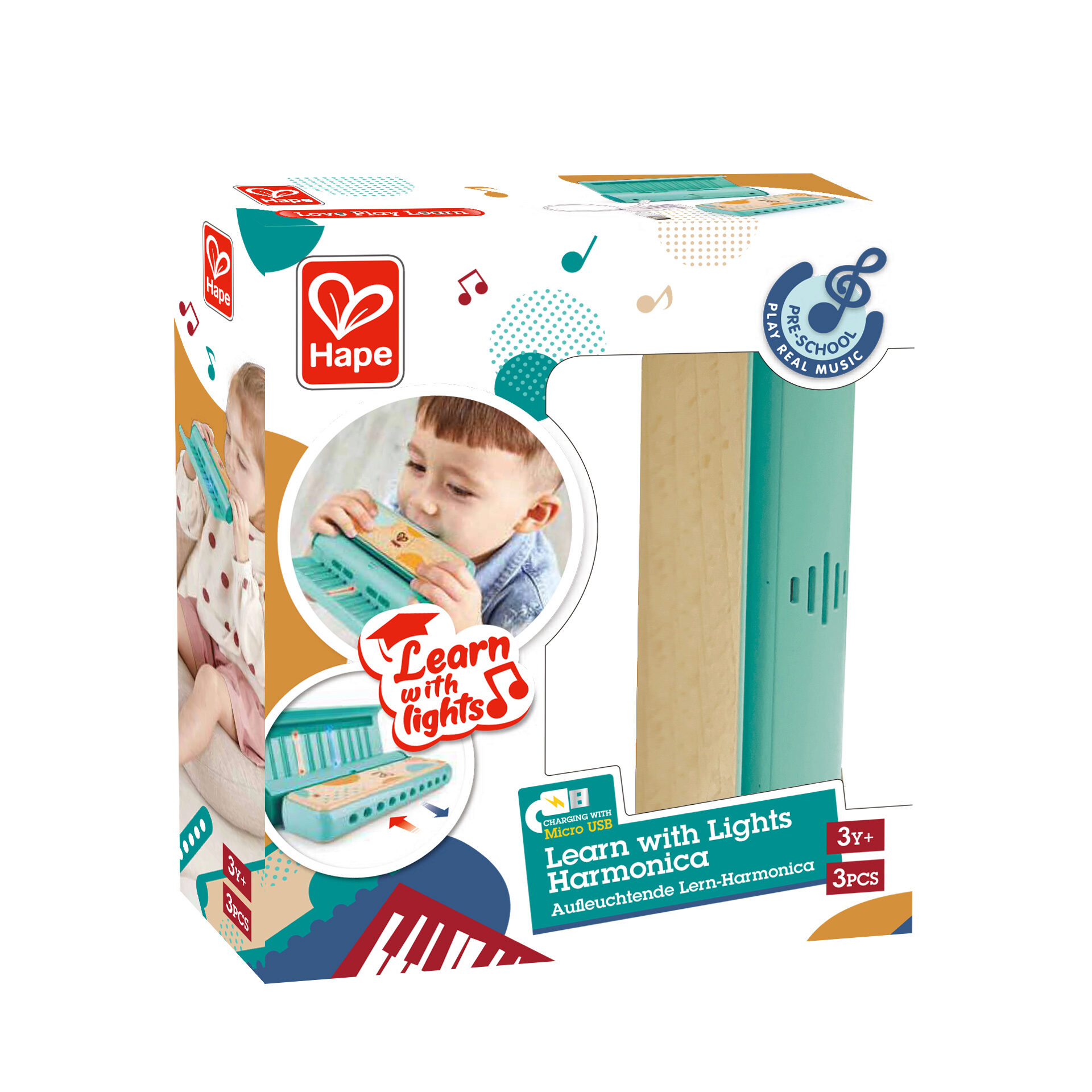 Mit der Lern-Harmonica können Nachwuchsmusiker fünf Melodien dank aufleuchtender Lichter auf der angesteckten Spieltafel ganz einfach nachspielen. Ob nach Lichtern spielen oder in den Bandmodus wechseln, um die zusätzlichen Instrumente dazu zuschalten - ganz egal. Auch ein freies Spiel möglich. Die angesteckte Spieltafel ist verstellbar, sodass man sie beim Spielen gut im Blick hat. Sie wird mit einer Batterie betrieben, die mit dem mitgelieferten Kabel wieder aufgeladen werden kann. Die Spieltafel dient auch als Deckel für die Mundharmonika, sodass sie beim Transport sauber bleibt. Die Mundharmonika kann auch ohne die angesteckte Spieltafel bespielt werden. Für Kinder ab 3 Jahre.