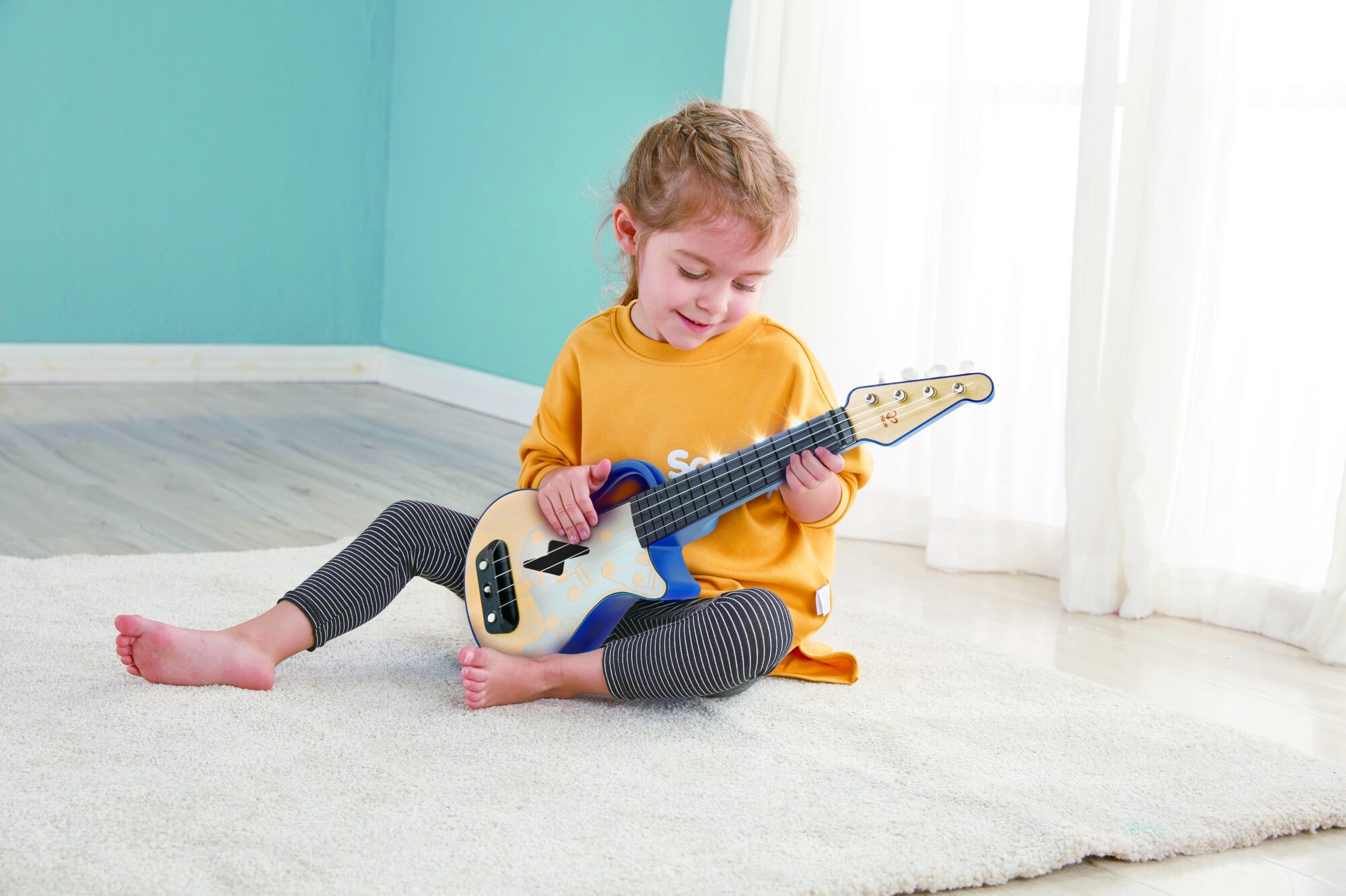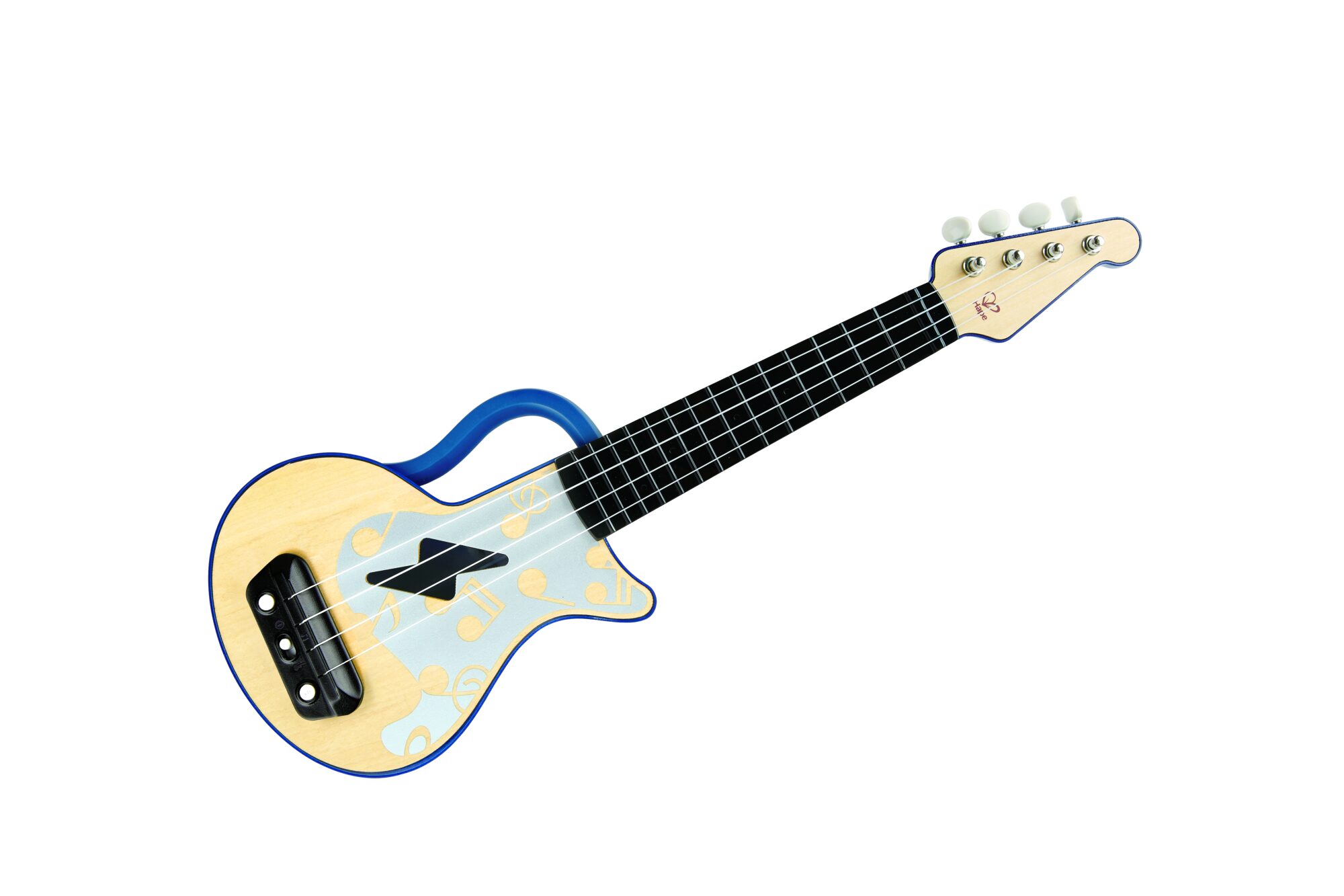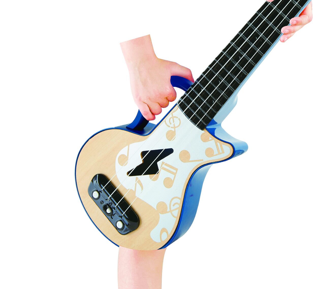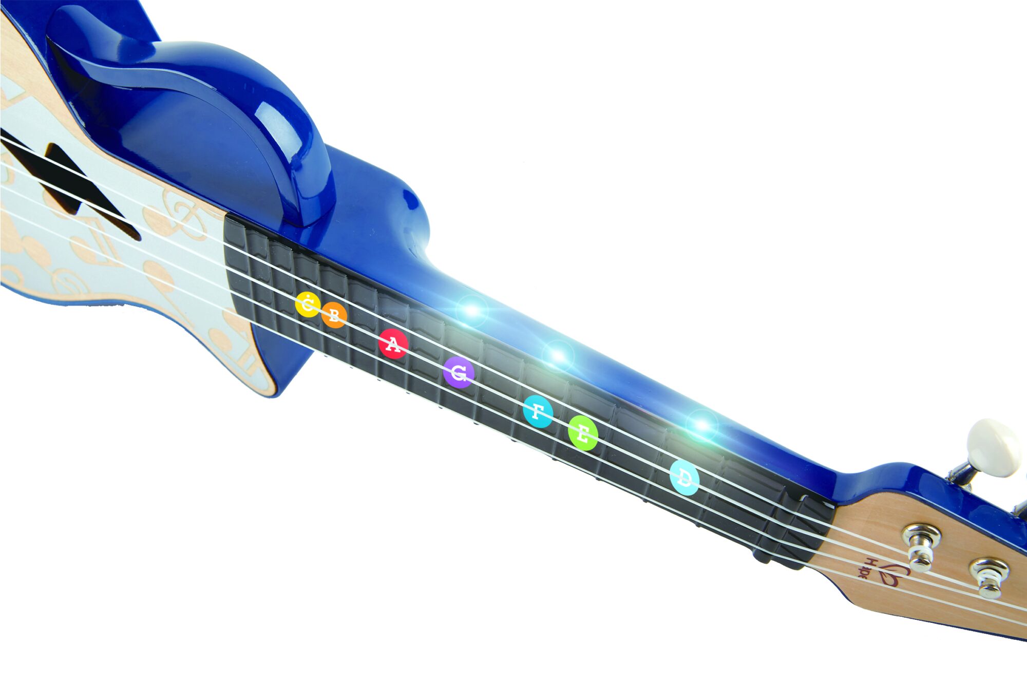 Auf der elektrischen Ukulele leuchten die Saiten auf, wenn sie bespielt werden sollen! Inklusive Saitensticker und einem Begleitheft.Entweder sechs Melodien nach Lichtern spielen oder in den Bandmodus wechseln, um die Geschwindigkeit zu erhöhen und die Begleitinstrumente dazu zuschalten. Die Ukulele mit realistischem Klang lässt sich dank praktischem Griff leicht transportieren. Sie verfügt über echten Saiten, die sich tatsächlich stimmen lassen und wird inklusive einer Ersatzsaite geliefert. Im Lieferumfang sind drei AAA 1.5 V Batterien enthalten. Für Kinder ab 3 Jahre