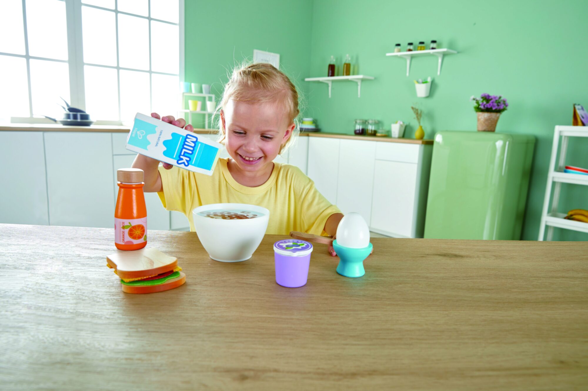 Das Frühstücks-Set enthält einen Joghurt, Milch und Orangensaft. Außerdem können sich Hungrige über Brot und Aufschnitt und andere Leckereien freuen.