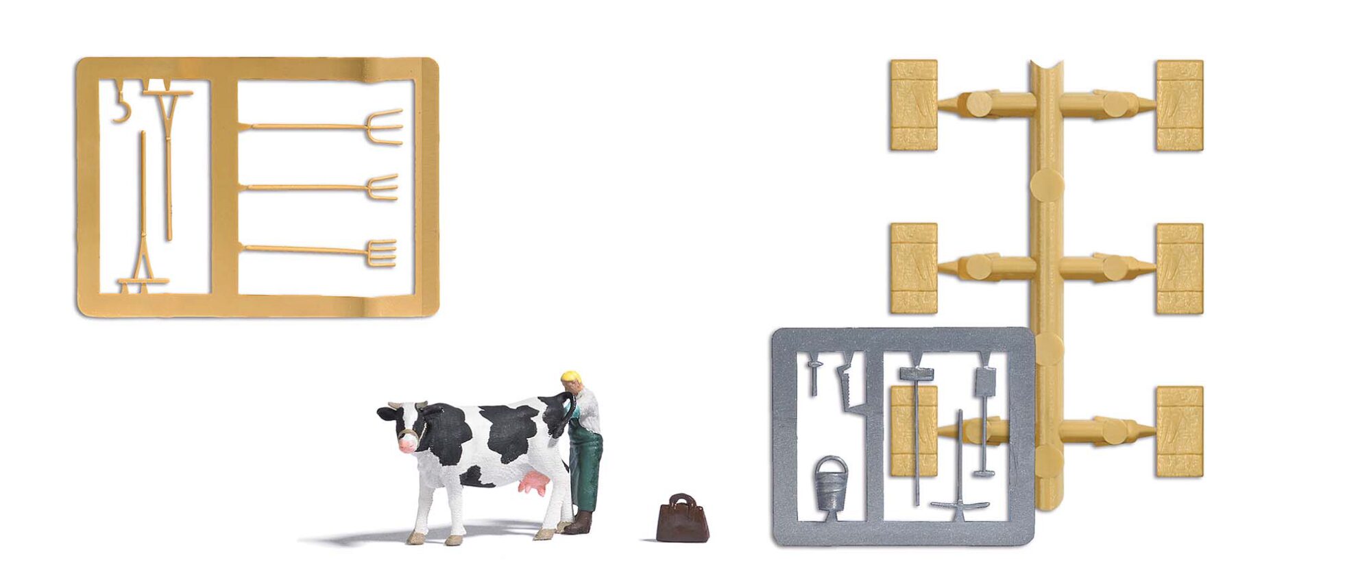 Action Set für die realistische Belebung Ihrer Modellwelt. Besamungstechniker bei der Arbeit. Mit Kuh, Heuballen und Stallwerkzeug.