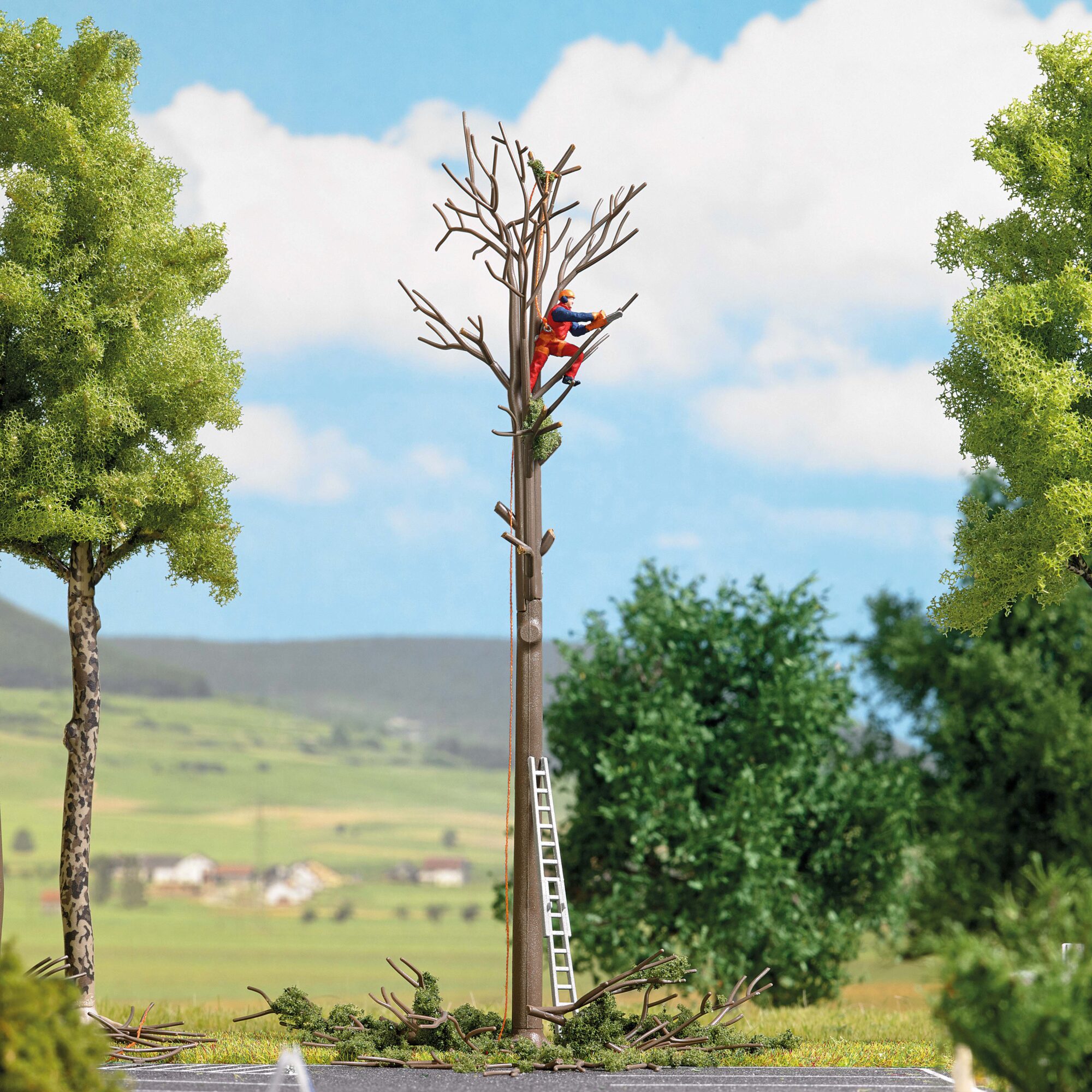 Baumschnitt-Szene mit kommunalem Mitarbeiter in Sicherheitskleidung, der mit der Kettensäge die Baumpflege am hohen Baumstamm von oben nach unten vornimmt. Mit Leiter und abgeschnittenem Astwerk.
