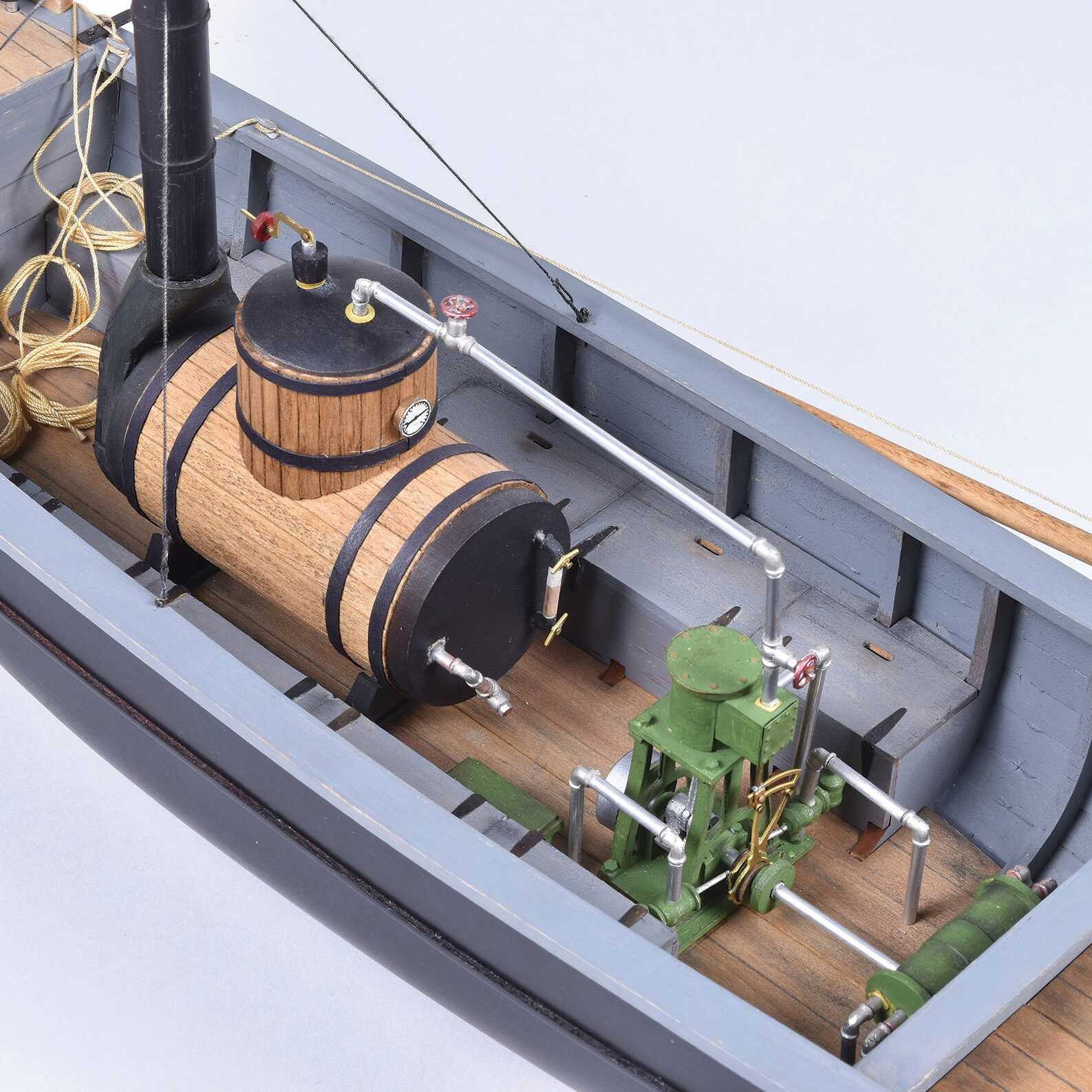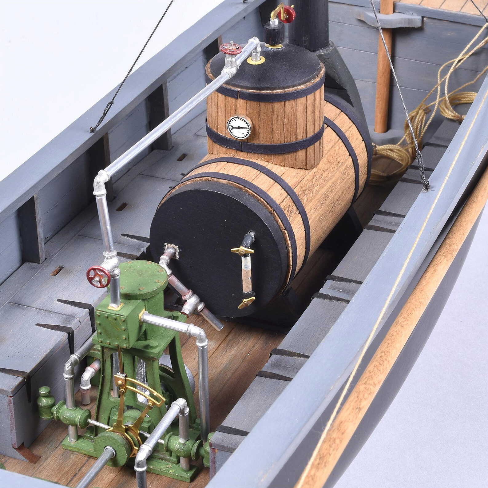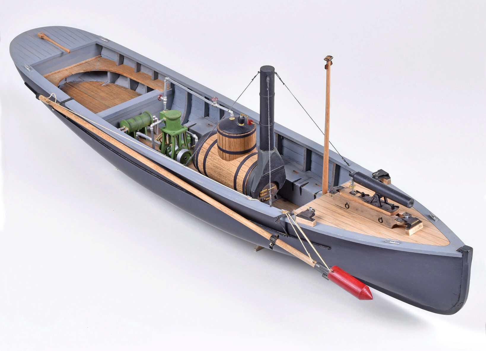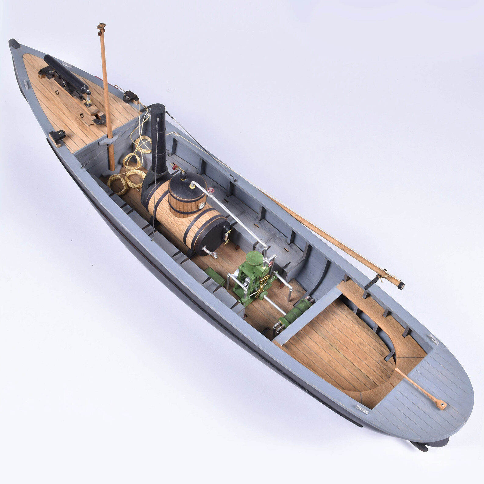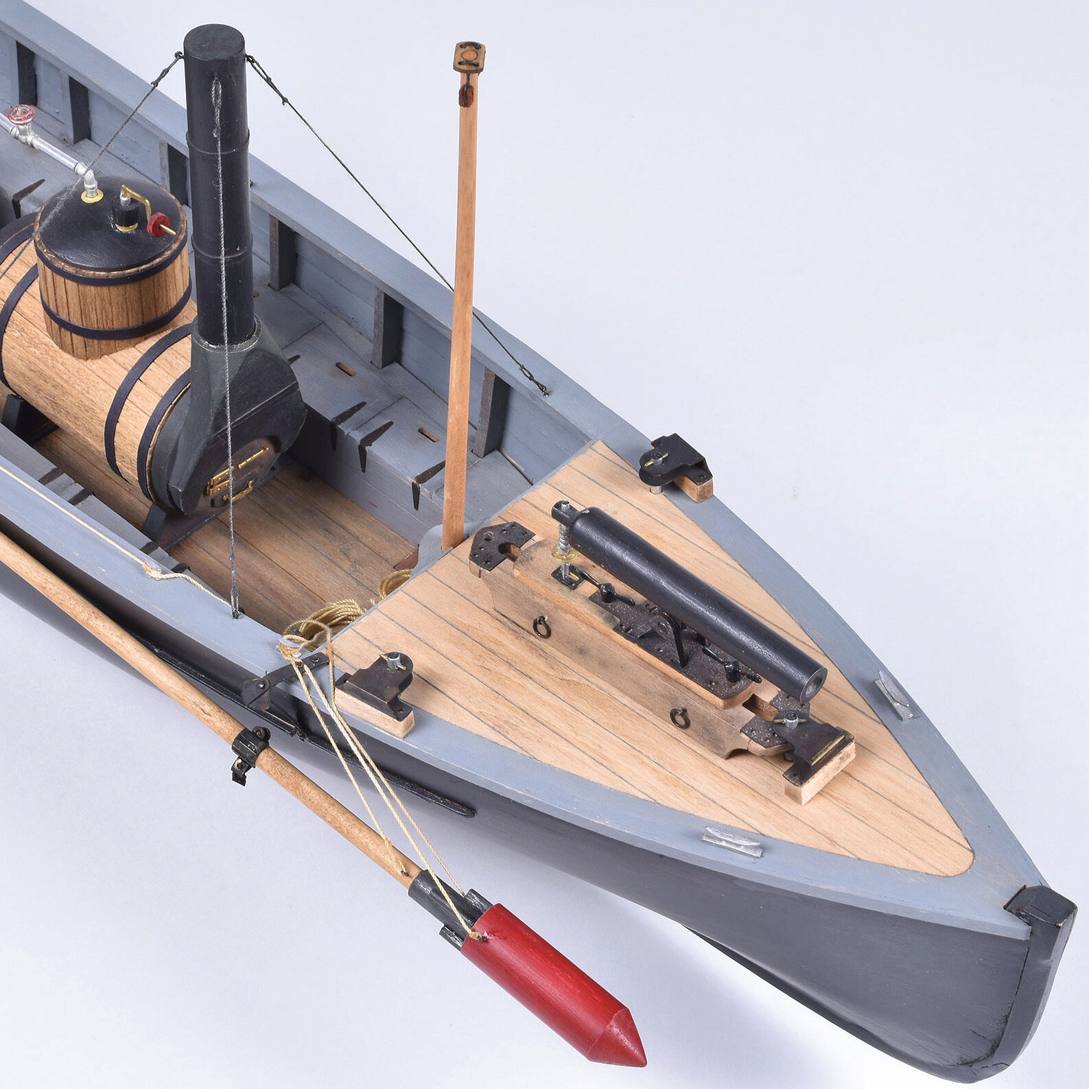 Holzmodellbausatz eines US-amerikanischen Dampfbootes, gebaut 1864. Genutzt wurden die Boote zur Blockade der US Navy gegen die Konföderierten. Ein Boot dieser Klasse versenkte mittels Torpedo das Kanonenboot CSS Albermale. Holz-Bausatz mit Metallteilen,