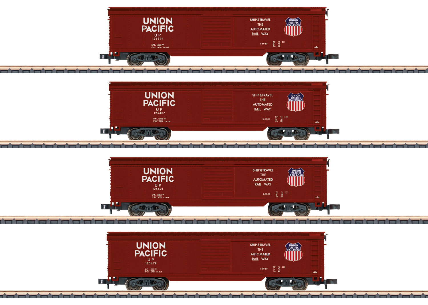 Vorbild: 4 US-Box-Cars der Union Pacific (U.P.), im Zustand der Epoche III in den 1960er Jahren