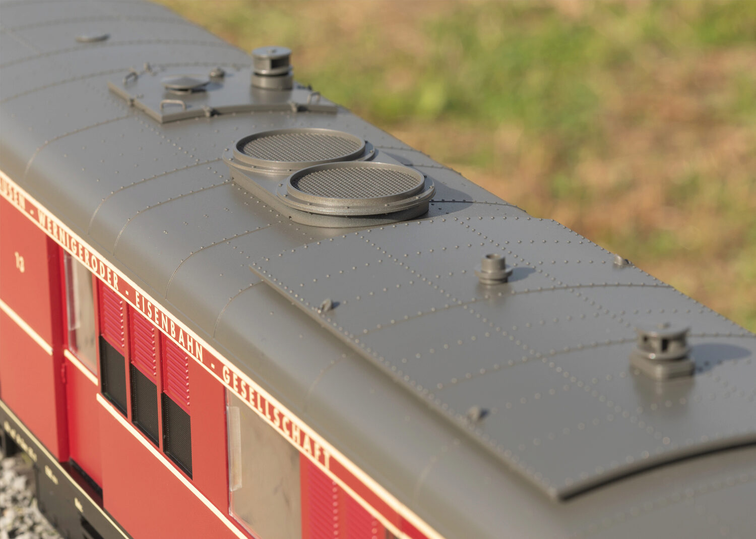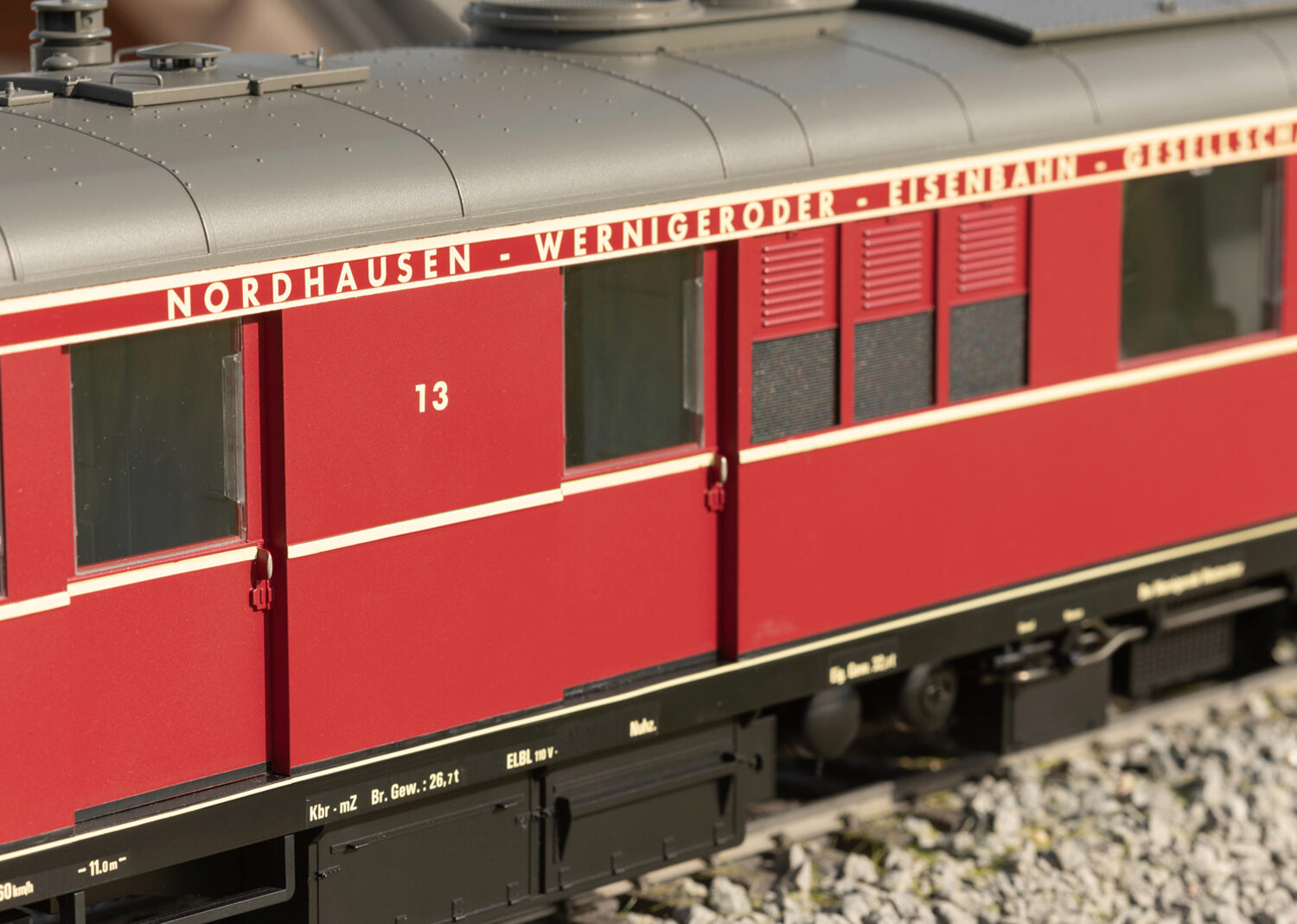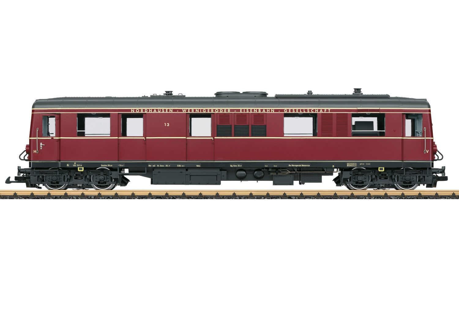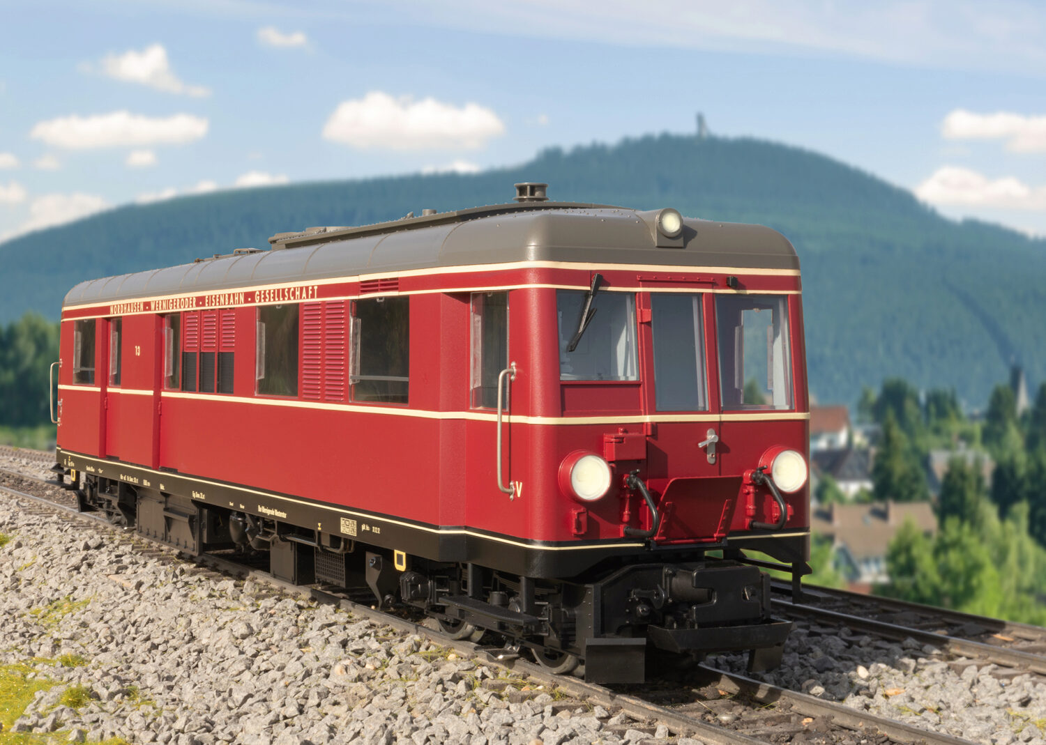 Modell des Dieseltriebwagens T3, wie er heute noch bei der HSB vorhanden ist. Originalgetreue rote Farbgebung und Beschriftung der Epoche VI. Vier Radsätze von zwei leistungsstarken kugelgelagerten Bühler-Motoren angetrieben. Dadurch ist der sehr zugkräftige Triebwagen in der Lage - so wie sein großes Vorbild - auch mehrere Wagen zu ziehen. Ausgerüstet mit einem mfx/DCC-Decoder mit vielen Licht- und Soundfunktionen. Innenbeleuchtung und Führerstandsbeleuchtung, im Digitalbetrieb schaltbar. Länge über Puffer 64 cm.