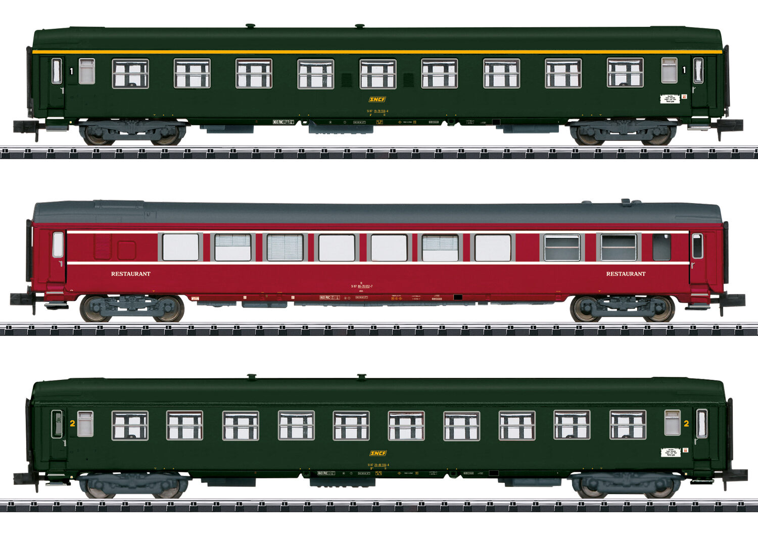 Vorbild: 1 Schnellzugwagen 1. Klasse (A9), 1 Schnellzug-Speisewagen (Vru) und 1 Schnellzugwagen 2. Klasse (B10)der Französischen Staatseisenbahn (Société nationale des chemins de fer français / SNCF). Im Zustand um 1970 mit dem Zuglauf Nizza - Paris