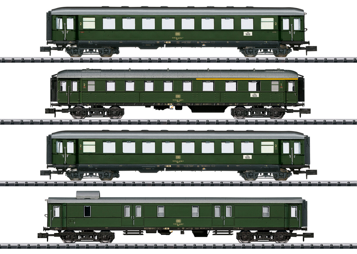 Vorbild: 2 Eilzugwagen 2. Klasse windschnittiger Bauart Bye 670, 1 Eilzugwagen 1./2. Klasse Bauart AByse 617 und 1 Reisezug-Gepäckwagen Bauart Düe 938 (Pw4ü-36) im Zustand um 1969 als E 4505 der Deutschen Bundesbahn (DB) in chromoxidgrüner Farbgebung