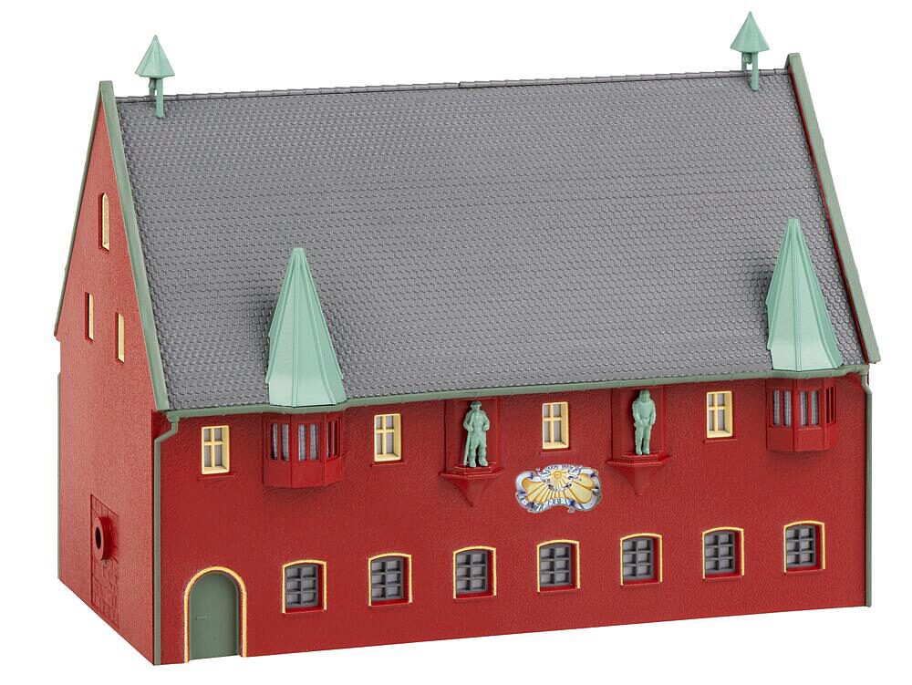 Gebäudemodell mit markant dunkelroter Fassade in Anlehnung an das »Historische Kaufhaus« in Freiburg im Breisgau. Die Frontseite des Gebäudes verzieren Fassadenskulpturen, eine Wandmalerei und zwei Erker.