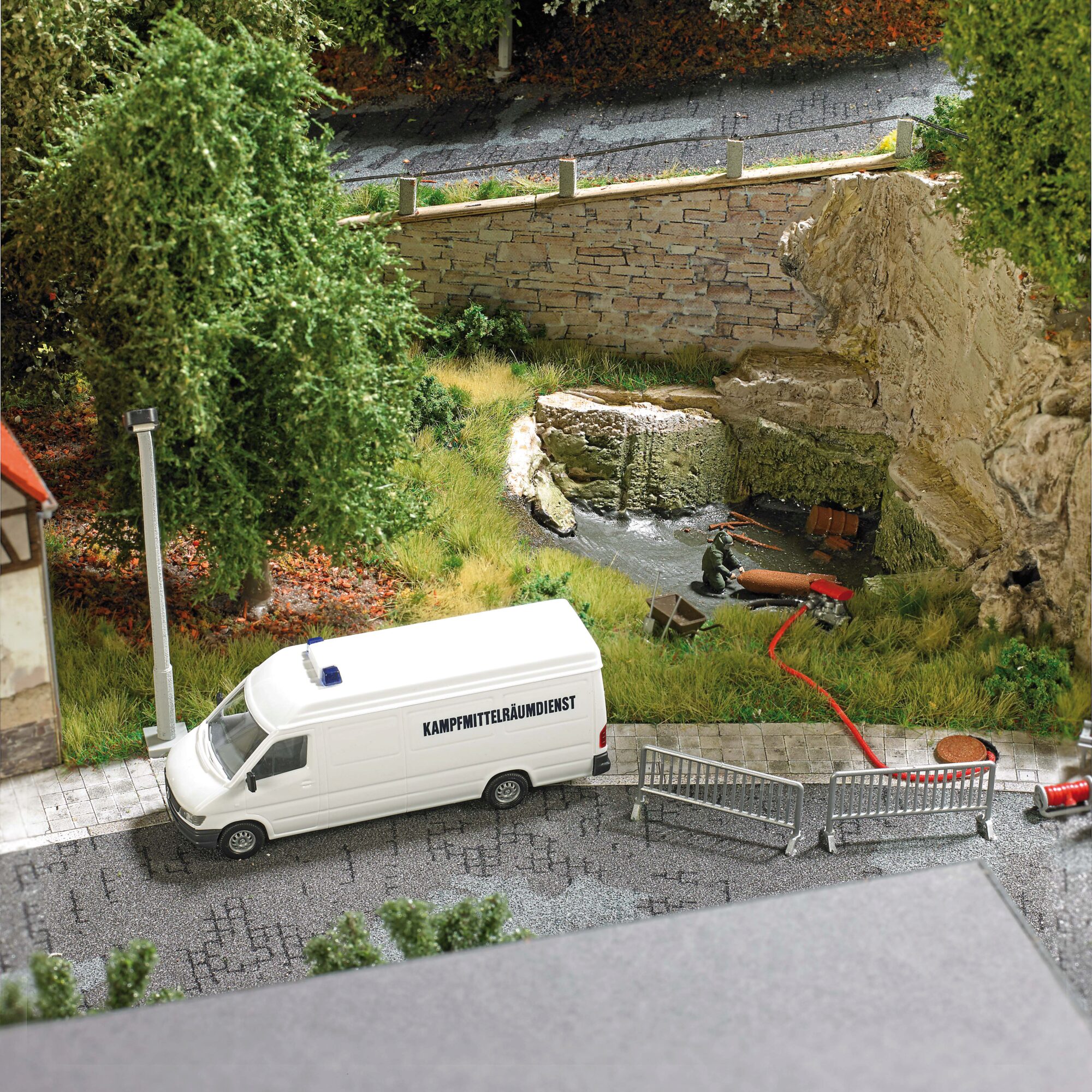 Szene für eine Bombenentschärfung. Inklusive Mitarbeiter des Kampfmittelräumdienstes bei der Arbeit, Schubkarren, Werkzeug, Sandhaufen, Absperrungen und Fliegerbombe. Mit Mercedes-Benz Sprinter »Kampfmittelräumdienst«.