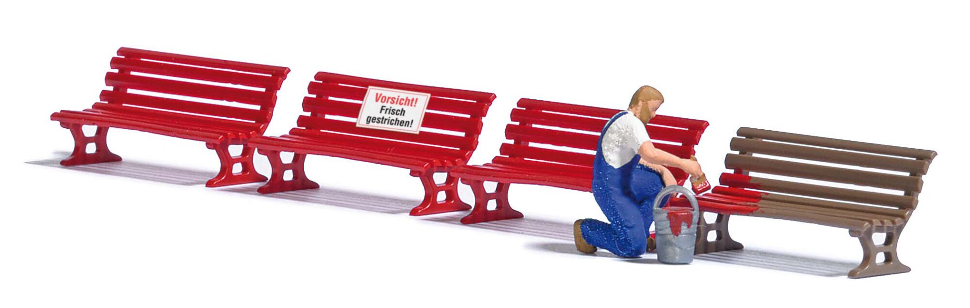 Maler, der eine Parkbank streicht. Mit 4 Parkbänken und Farbeimer. Inklusive Schildern »Frisch gestrichen« zum Ausschneiden.