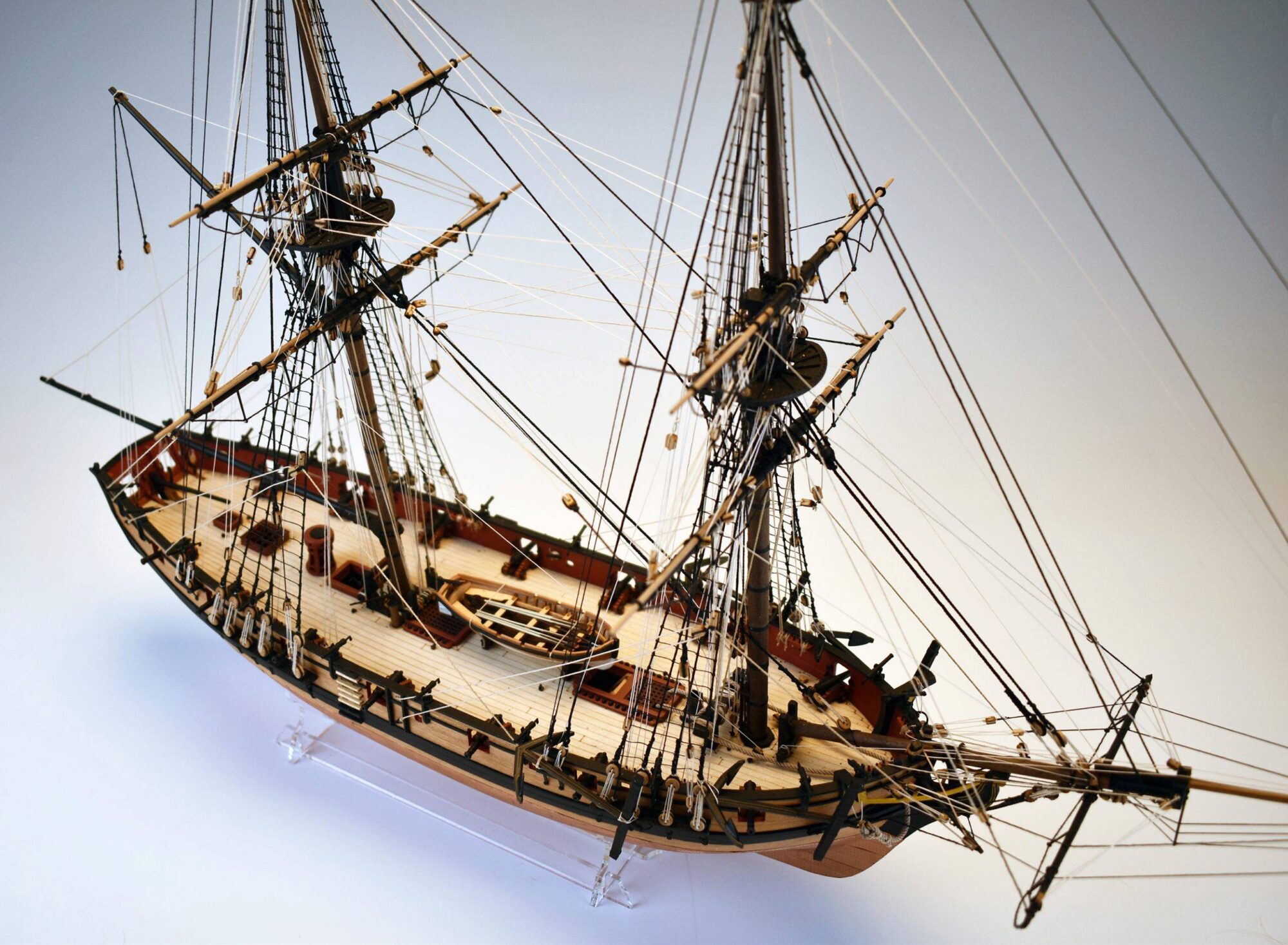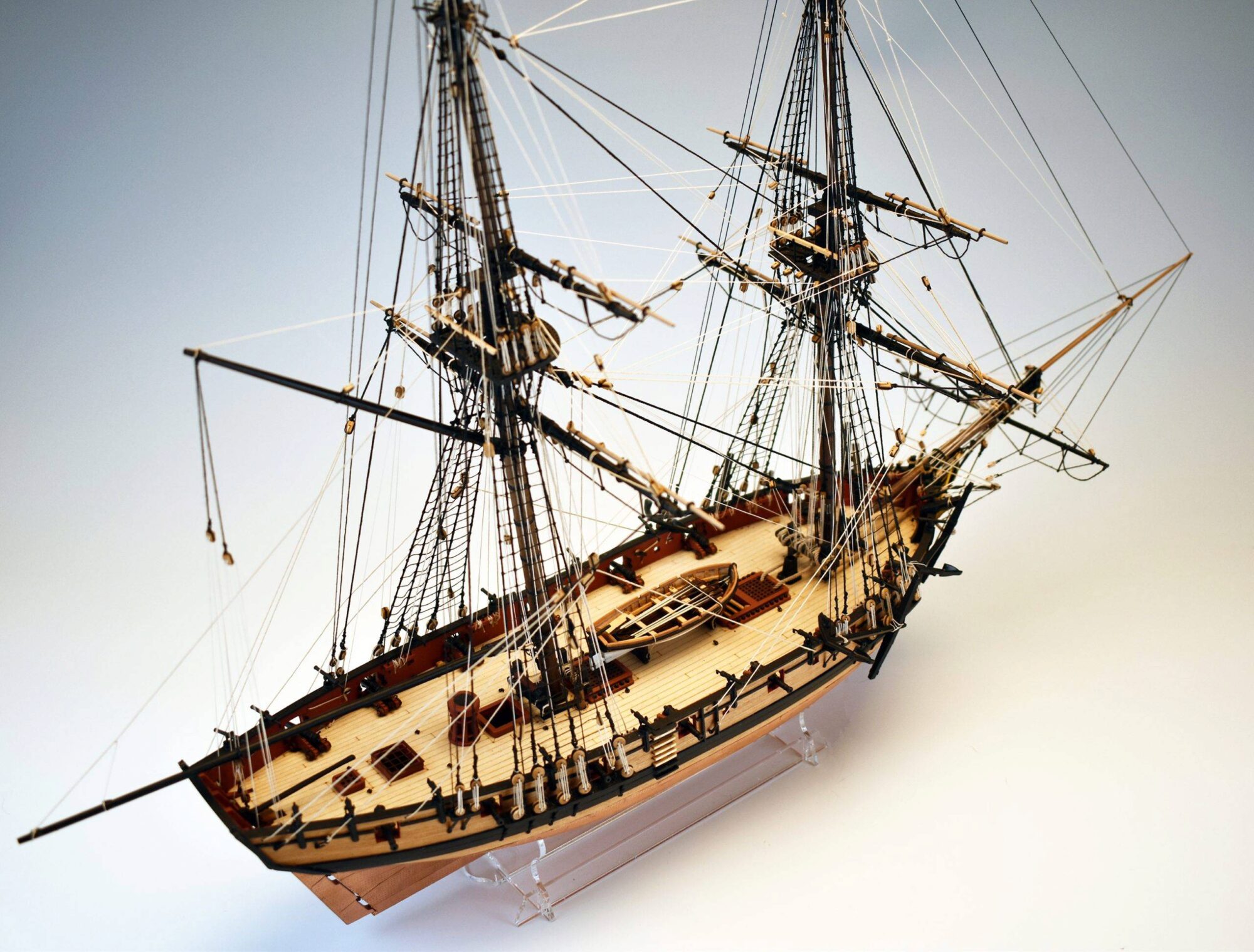 Für die Modellbauer, die gerne Details hinzufügen, die über das hinausgehen, was die Bausätze bieten, enthält der Speedy-Bausatz das Unterdeck, das nach achtern abgestuft ist und sich in der richtigen Höhe zum Hauptdeck befindet. Es gibt viel mehr Spanten als bei Standardbausätzen dieser Größe, um die sehr feinen Rumpflinien beim Beplanken zu erhalten.