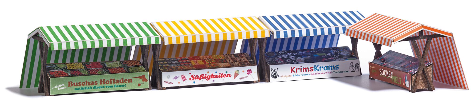 Bausatz für 4 Marktstände aus echtem Holz (Länge jeweils 50 mm). Mit unterschiedlichen Auslagen: Sockenwelt, Süßigkeiten, Hofladen und Krimskrams.