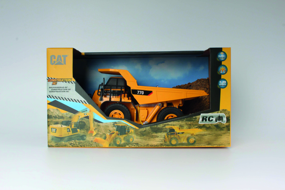 Vollbeladen auf der Baustelle Der RC Cat® 770 Muldenkipper verspricht die volle Ladung Baustellen-Spielspaß für die kleinen Bauleiter ab 8 Jahren. Dank der vollständigen Bewegung der hinteren Kippmulde steht das kleine Fahrzeug seinem großen Vorbild in der Funktion in nichts nach. Bei einer Fahrzeit von bis zu 45 Minuten ist der Cat® 770 auch für längere Einsätze auf dem Spielplatz im Sand oder Kies gewappnet. Über Baustelle und Fußboden bewegt sich der Mining Truck mit einer Höchstgeschwindigkeit von 5,5 km/h. Der lizenzierte Kipplader sieht dank der Originallizenz genau wie sein großes Vorbild auf der Baustelle aus und begeistert dadurch Fans aller Altersgruppen.