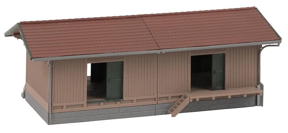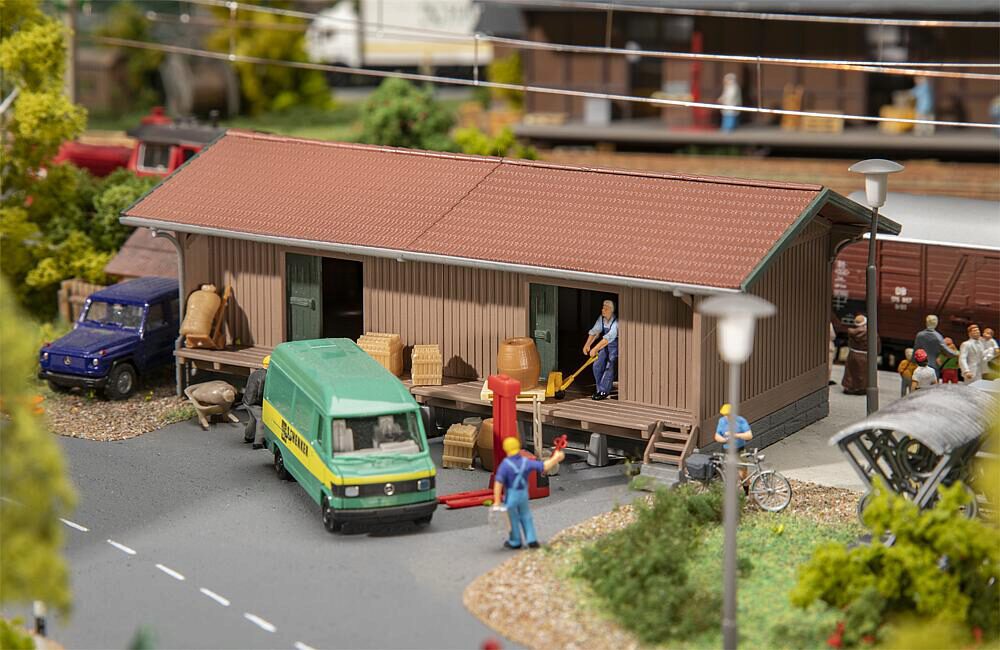 Warentransport! Güterschuppen in Holzbauweise mit Steinsockel, Satteldach, vier Schiebetoren und überdachten Verladerampen zur Bahn- und zur Straßenseite.
