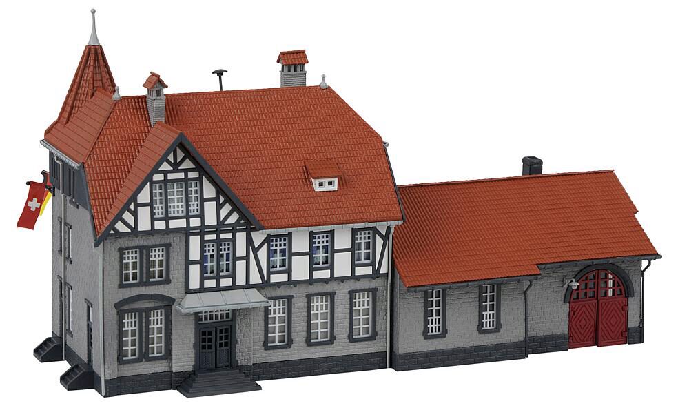 Zweigeschossiges Rathaus mit Feuerwehrhaus und angebauter Fahrzeughalle. Das Stein- und Fachwerkgebäude im Baustil der Jahrhundertwende bietet insgesamt vier Stellplätze hinter feuerroten Rundbogen-Toren. Neben dem Eckturm lädt eine Außentreppe mit Vordach zum Betreten ein.