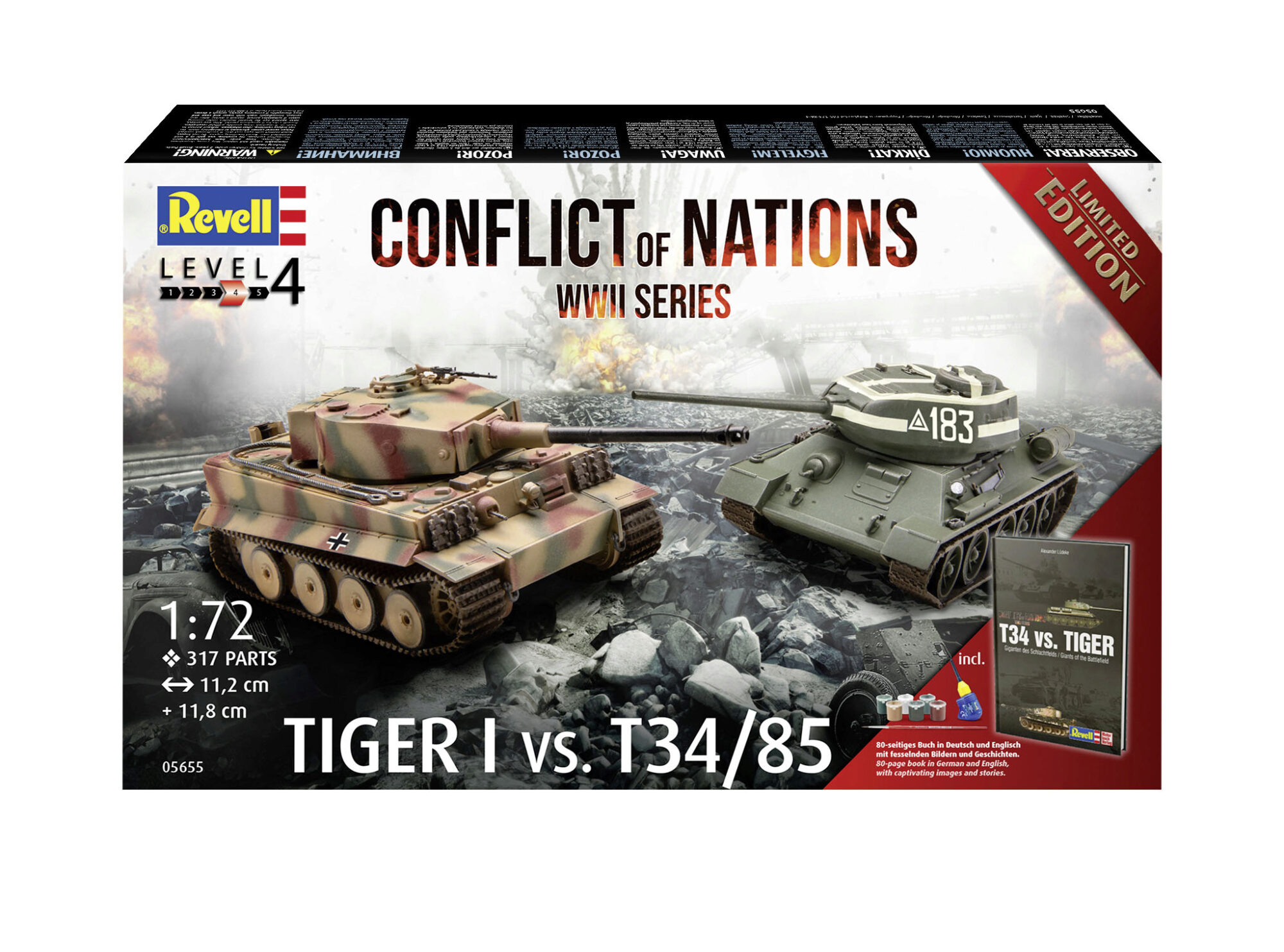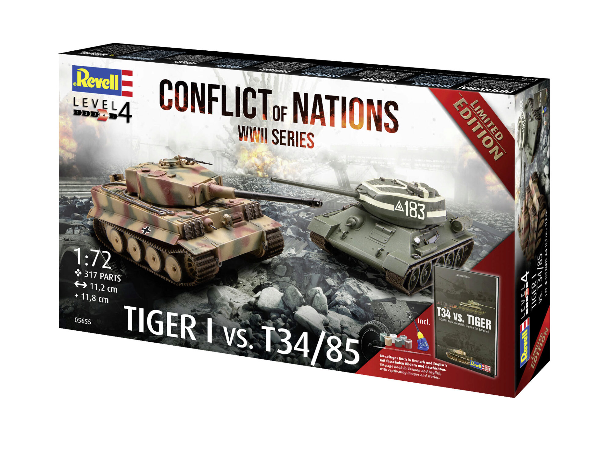 Willkommen beim Conflict of Nations: WWII Exclusive-Set, einer einzigartigen Gelegenheit für Geschichtsenthusiasten und Modellbau-Enthusiasten. In diesem Set finden Sie zwei erstklassige Modellbausätze im Maßstab 1:72 - den legendären T-34/85 und den gefürchteten Tiger I. Mit insgesamt 317 Teilen können Sie diese ikonischen Panzer detailgetreu nachbilden.
