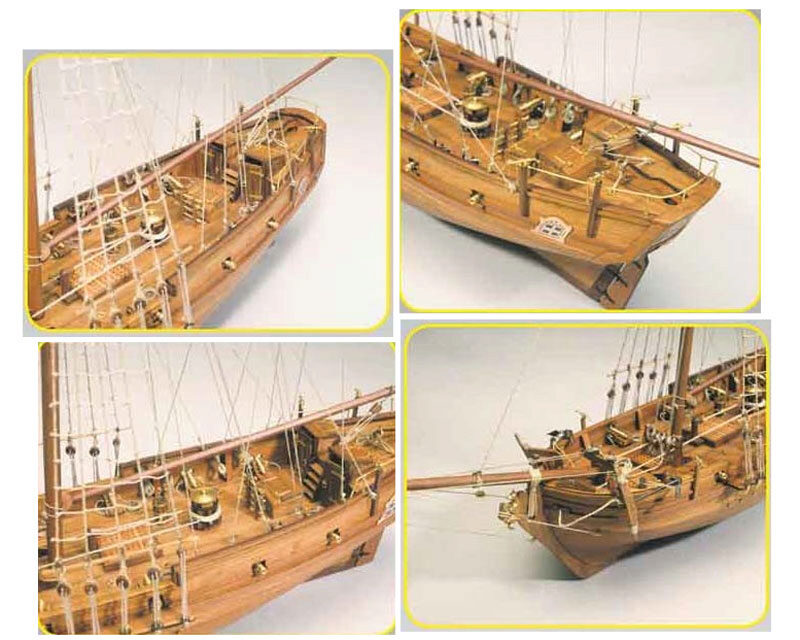Der Bausatz wurde überarbeitet und ist fertigungstechnisch auf dem heutigen Stand. Der Baukasten ist komplett mit allen Beschlagteilen gut ausgestattet. Der Rumpf wird aus gelaserten Kiel und Spannten aufgebaut und doppelt beplankt. Bei den sichtbaren Decks sind die Planken und Kafalterung schon eingraviert. Baubeschreibung und 2 beidseitig bedruckte Planbögen erläuteren den Aufbau des Modells. Die Beplankung wird aus Nussbaum- und Lindenholzleisten hergestellt. Masten und Spieren aus Rundholz, Beschläge aus Messing und Nussbaumholz, Takelgarn, Segeltuch und Seidenflagge hehören zum Lieferumfang des Baukastens. Alle Sperrholzteile sind mit Laser zugeschnitten.