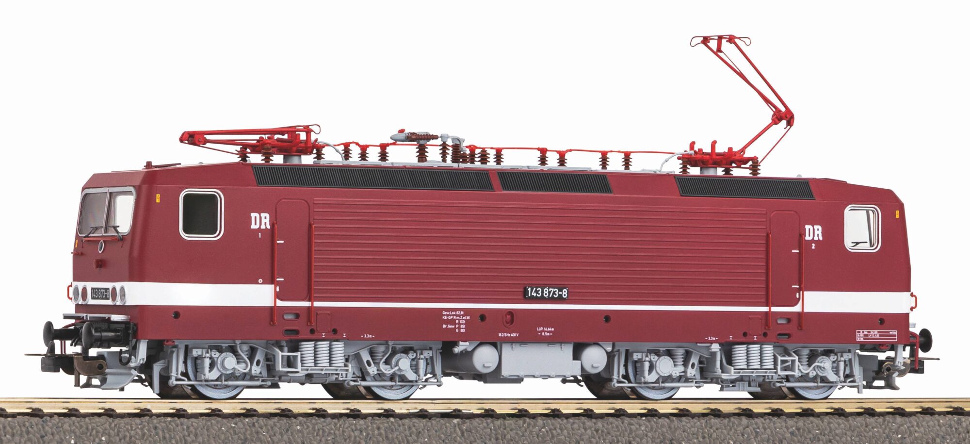 Druckvariante der BR 143 in der Ausführung der DR in Epoche V. Das PIKO Modell überzeugt durch den gelungen Formenbau ohne störende Formtrennkanten und die stimmige Umsetzung aller relevanten Details der Vorbildmaschine. Die Beleuchtung erfolgt mittels LEDs. Die Führerstandbeleuchtungen und die fahrtrichtungsabhängig funktionierenden Front- und Schlusslichter sind mit dem werkseitig integrierten PluX22-Decoder digital schaltbar. Das mit einem Zinkdruckgussrahmen versehene Modell verfügt über einen fünfpoligen Motor mit präzise ausgewuchteten Schwungmassen für hervorragende Fahreigenschaften und zwei Haftreifen für hohe Zugkräfte, die auf den innenliegenden Achsen beider Drehgestelle diagonal angeordnet sind. Ansteckbare Bremsschlauchattrappen liegen dem Modell der BR 143 bei.