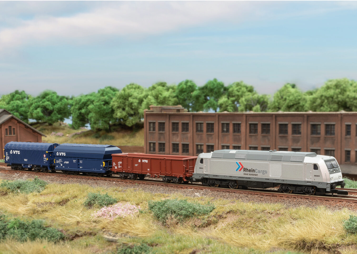 Vorbild: 1 Diesellok BR 285 der RheinCargo. 3 Güterwagen der VTG, davon 1x offener Güterwagen Typ Eaos, 1x Selbstentladewagen Typ Falns und 1x Schiebeplanenwagen Shimmns. Alle Fahrzeuge im Betriebszustand der Epoche VI