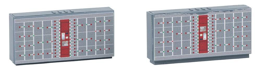 Zwei graue Schließfachschränke mit unterschiedlich großen Fächern im Set.