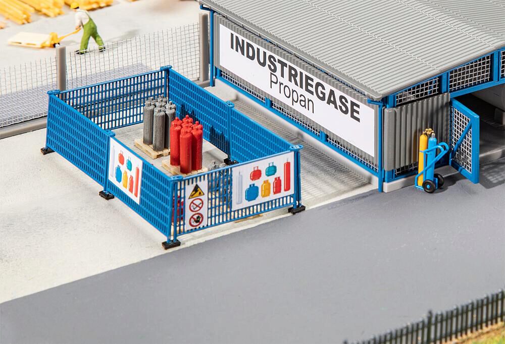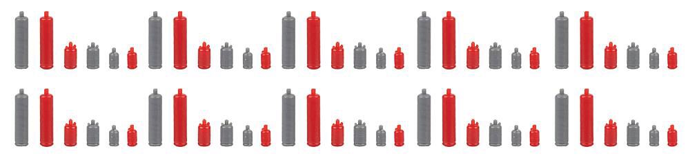 Sechzig Gasflaschen in drei verschiedenen Größen und zwei verschiedenen Farben.