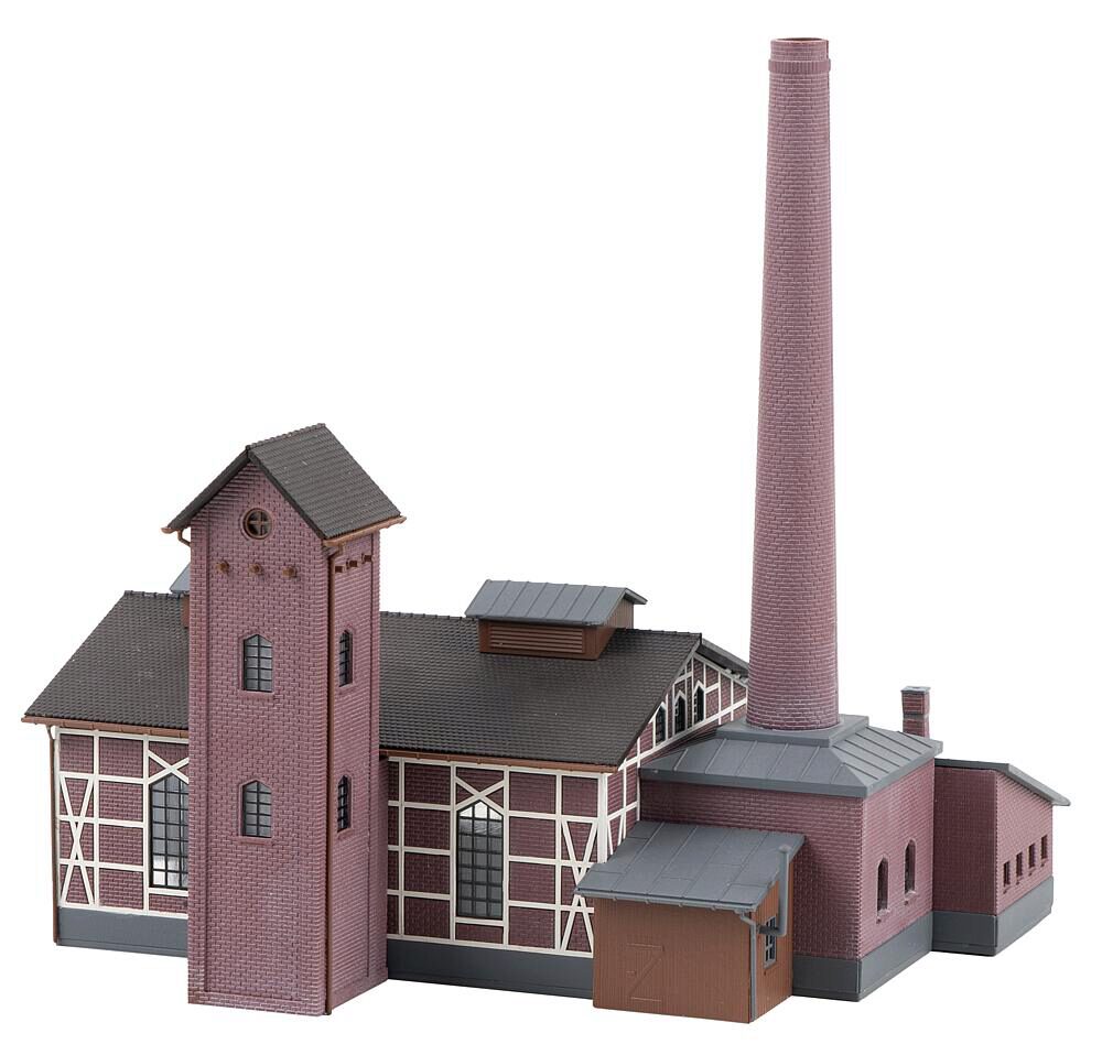 Warmwasser-Heizwerk mit Turmanbau, hohem Schornstein, Büroanbau, Holzschuppen und einer Torzufahrt ins Kesselhaus für den Antransport des Brennstoffs.