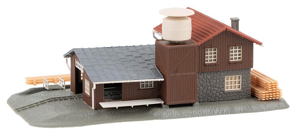 Kleines Sägewerk mit Laderampe. Für die Ausstattung des Modells liegen ein Mühlrad, ein Spänebunker und Bretterstapel bei. Bodenplatte inklusive.