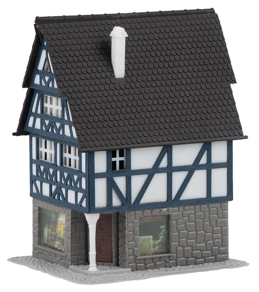 Kleines Fachwerkhaus mit Schindeldach und gemauertem Erdgeschoss, in dem sich eine Apotheke mit zwei Schaufenstern befindet.