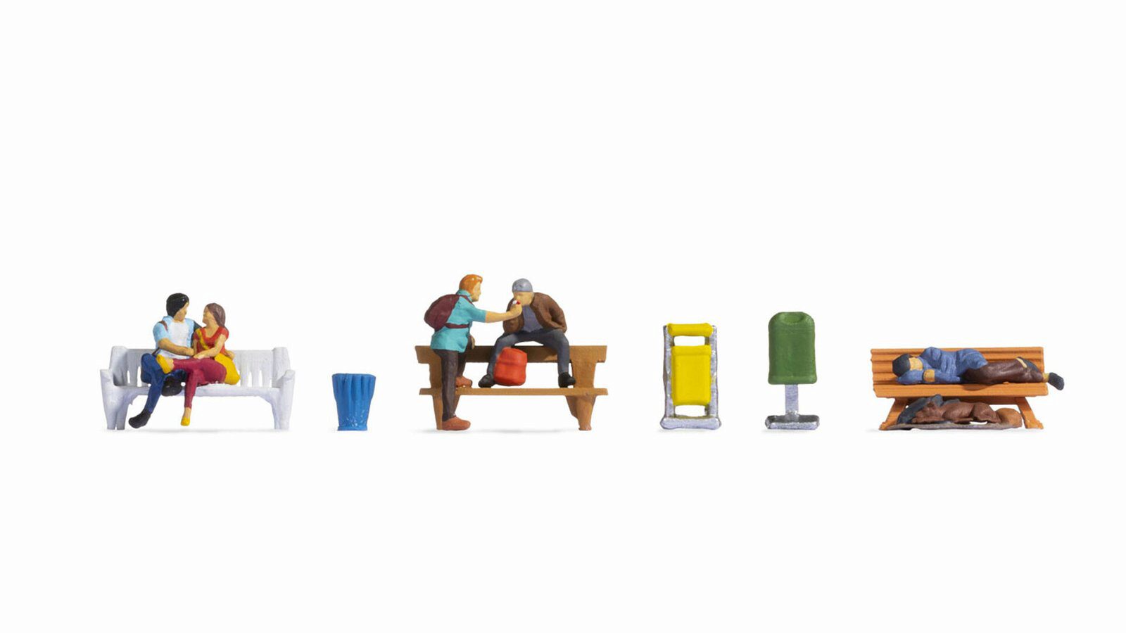 Ein Liebespaar sitzt gemeinsam auf einer Bank und zwei junge Männer unterhalten sich nebenan. Während der Mann mit Mütze auf der Lehne der Bank sitzt und seinen Rucksack vor sich abgestellt hat, stützt der andere sich mit einem Bein auf der Bank ab und trägt seinen Rucksack auf dem Rücken. Zudem ist ein Wohnungsloser enthalten, der auf einer Bank schläft. All sein Hab und Gut hat er unter der Bank auf einer Decke abgestellt. Auch sein Hund hat hier Platz gefunden. Leider sind auch heute noch zahlreiche Menschen von der Wohnungslosigkeit betroffen und müssen aus diesem Grund auf der Straße leben. Dank der Modellfiguren von NOCH können Sie jetzt auch diesen Teil der Realität im Modell nachbilden und Ihre Anlage mit allen Facetten der Wirklichkeit ausgestalten.