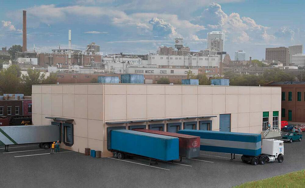 Plastikmodellbausatz eines modernen Lagerhauses in Betonoptik, mit Schienen und LKW-Anschluss. Beinhaltet viele Kleinteile. 30,4 x 17,1 x 8 cm.
