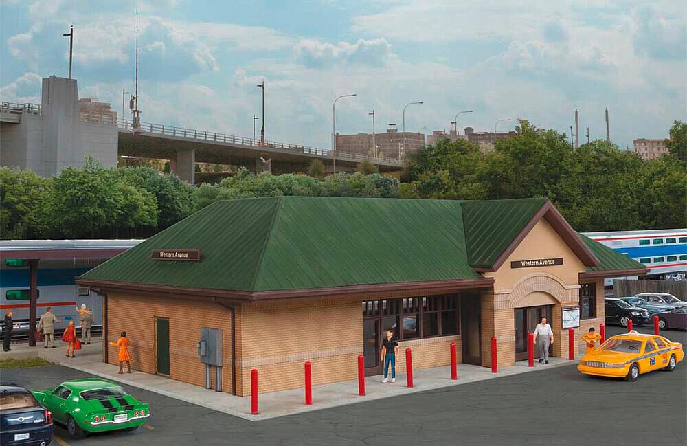 Plastikmodellbausatz eines modernen US-Vorstadt-Bahnhofes, wie sie ab den 1970er Jahren gebaut wurden. Mit zahlreichen Details und Kleinteilen. 26,5 x 16,5 x 7,9 cm.