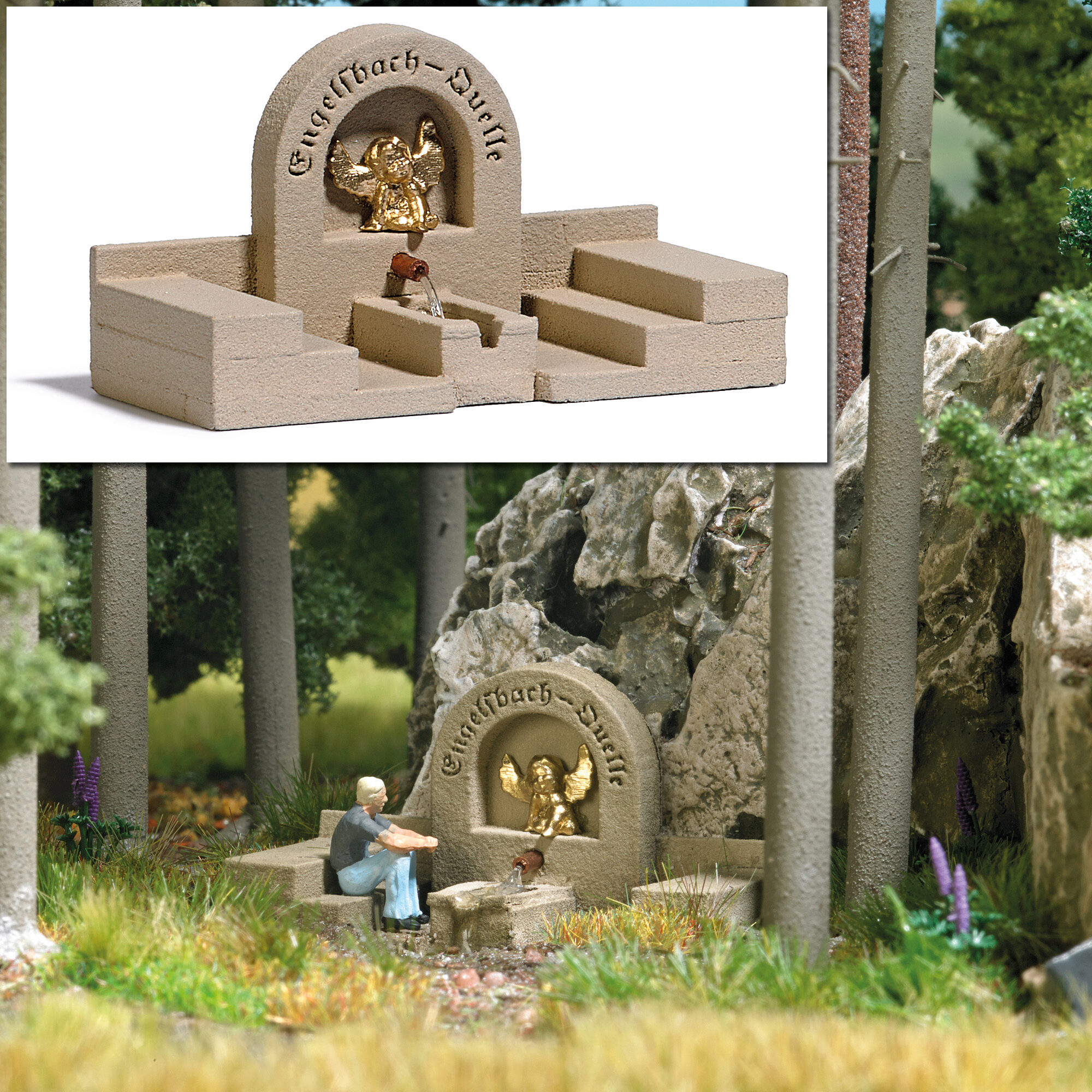 Die steinerne Quellanlage verfügt über Sitzstufen an beiden Seiten des Beckens. In dem halbrunden Quellstein mit Inschrift befindet sich eine goldene Engelsfigur. Mit Nachbildung des metallenen Wasserauslaufs und des Wasserstroms. Fertigmodell. Größe: 46 x 20 mm, Höhe: 25 mm.