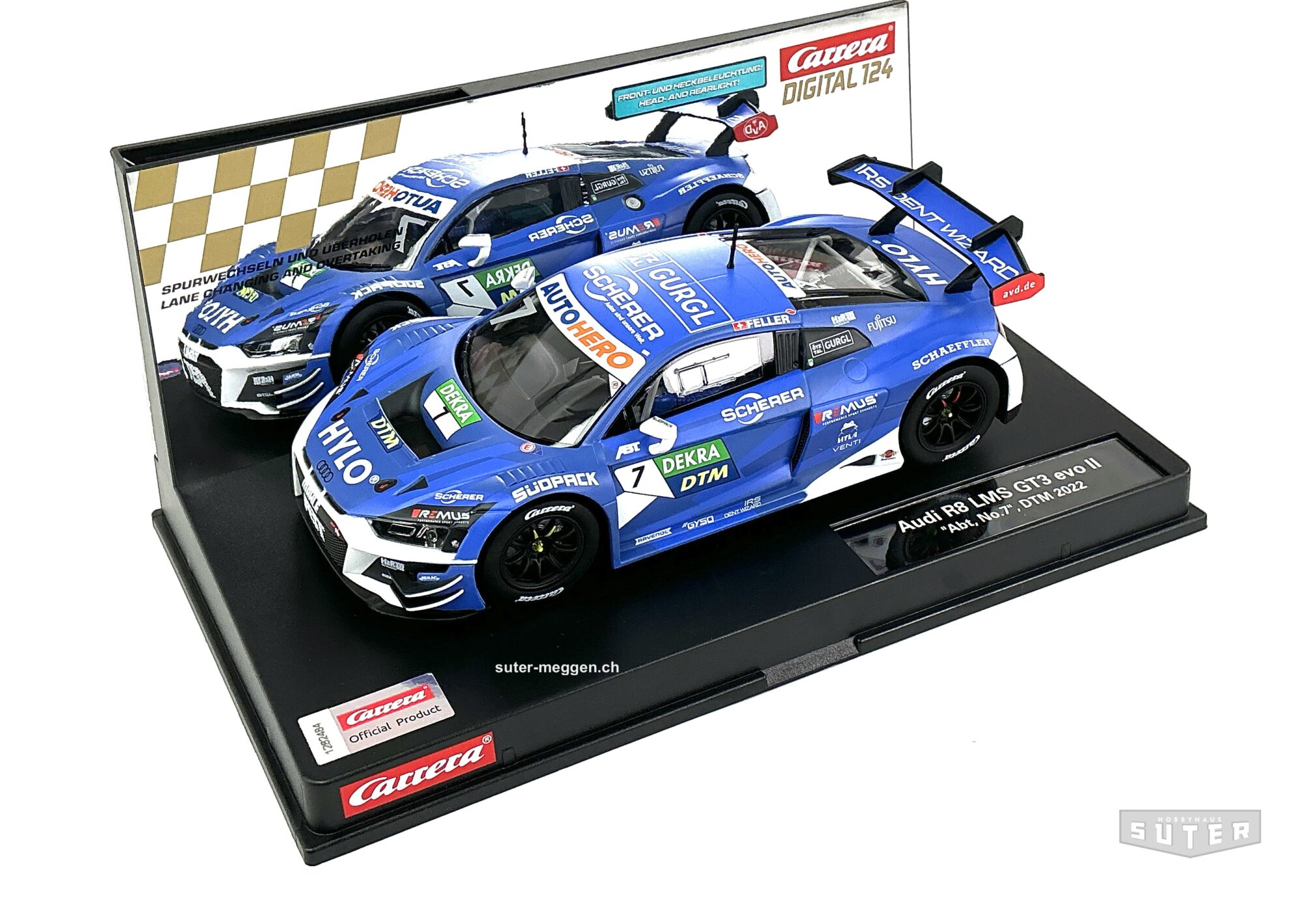 Der Carrera DIGITAL 124 Audi R8 LMS GT3 evo II „Team Abt. Sportsline, No.7“ demonstriert auch auf der heimischen Autorennbahn hohe Geschwindigkeiten und Leistung. Er begeistert mit einem eindrucksvollen Äußeren im Maßstab 1:24 sowie den voll funktionsfähigen Vorder-, Rück- und Bremslichtern. Das Slotcar ist individuell codierbar, hat eine digitale Steuerung und garantiert viele Stunden Fahrspaß.