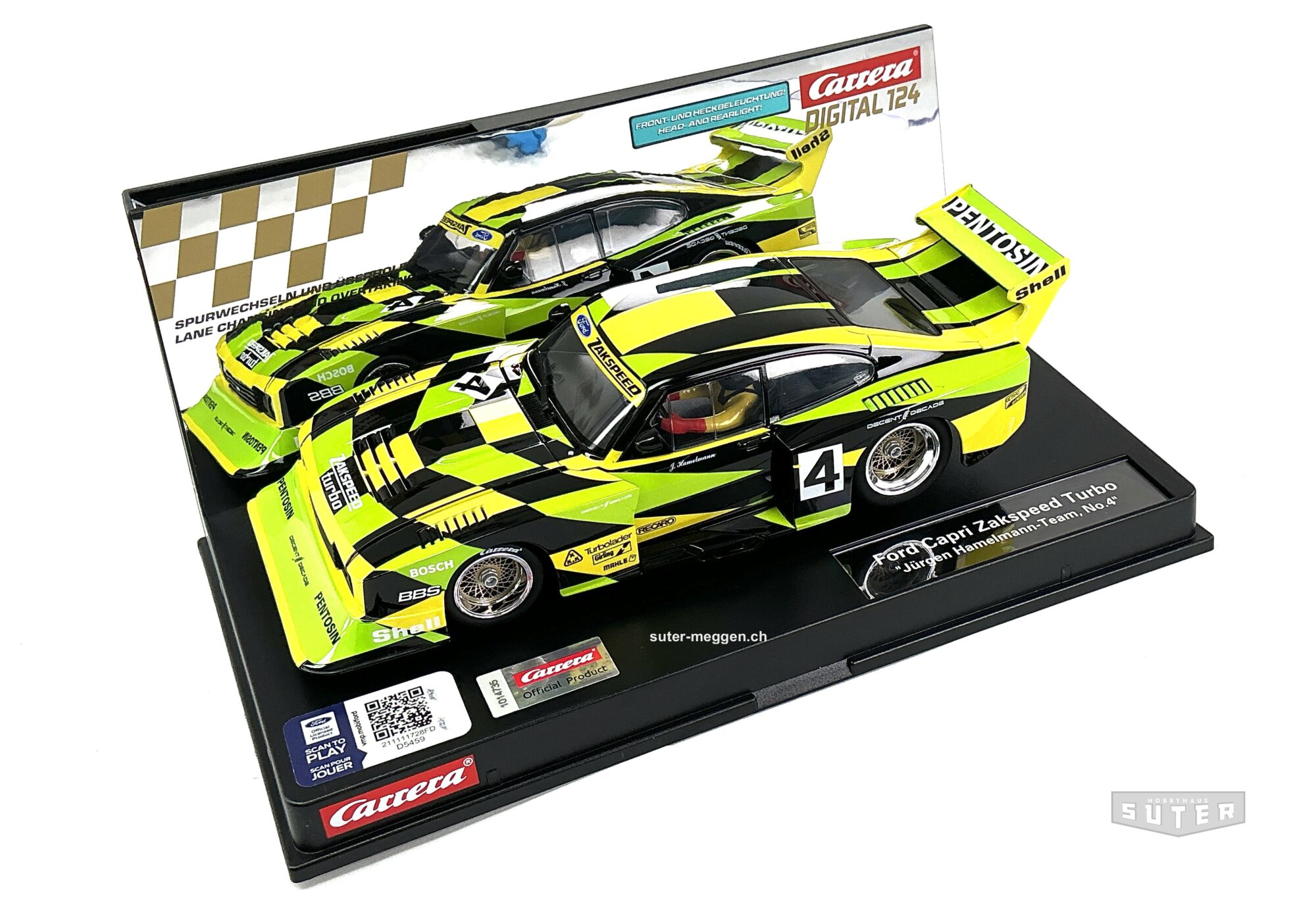Auch auf Deiner Strecke wird der Ford Capri Turbo vom Rennteam Zakspeed zum Eyecatcher. Der Rennwagen im Maßstab 1:24 glänzt aber nicht nur durch seinen Lack, denn auch die Front- und Rücklichter sowie die Bremslichter werden Dich beeindrucken. Das Slotcar lässt sich individuell codieren wodurch du das Beste aus Dir und Deinem Fahrzeug herausholen kannst. Außerdem ist der Ford Capri Turbo digital steuerbar.