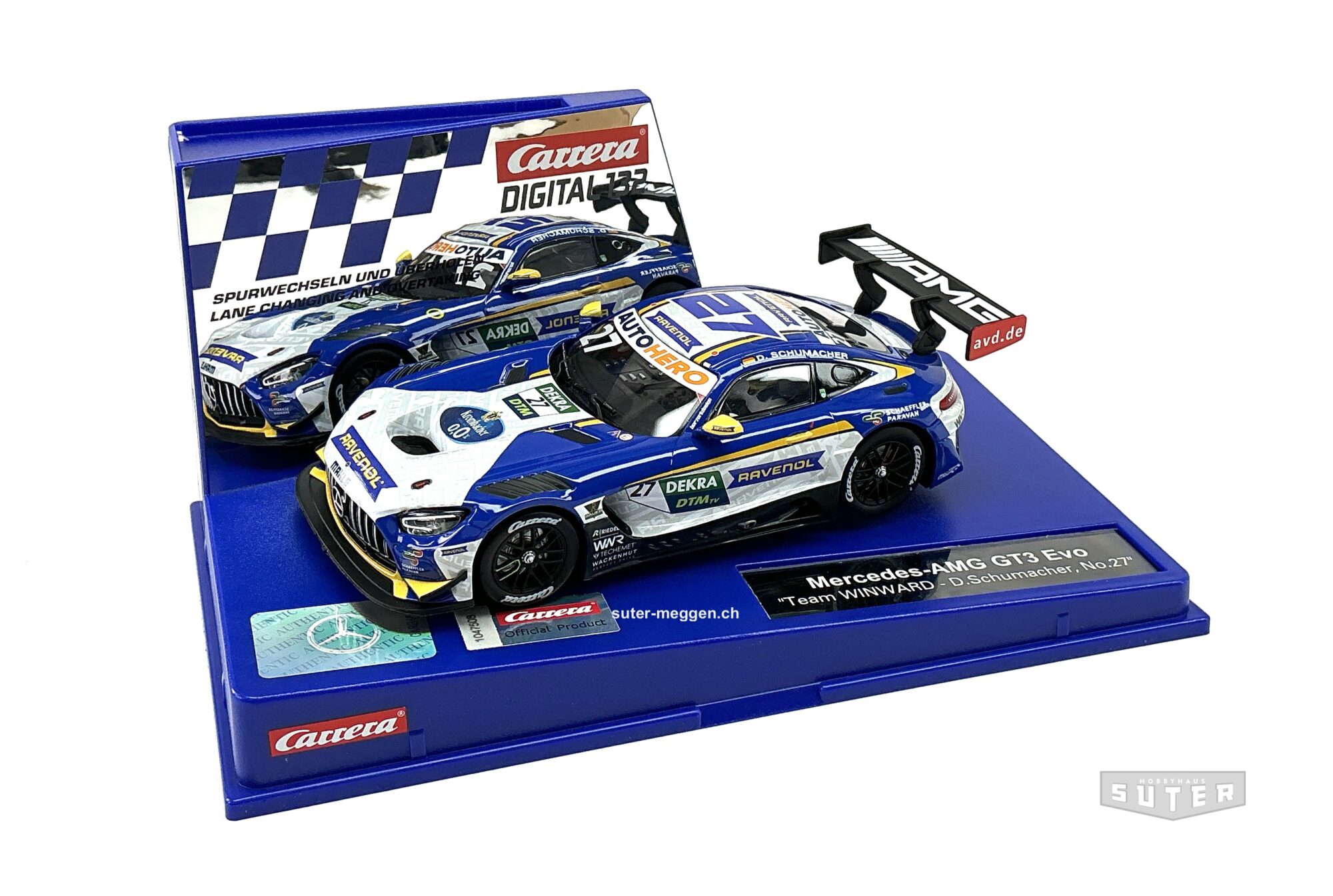 Der Carrera DIGITAL 132 Mercedes AMG GT3 Evo Mercedes-AMG „Team Winward D. Schumacher, No. 27" DTM 2022 ist das Fahrzeug für Fans des modernen Rennsports. Das Modell im Format 1:32 beeindruckt mit detailgetreuem Realismus und überzeugt zu jeder Zeit mit den funktionsfähigen Front-, Rück- und Bremslichtern. Das Slotcar ist individuell codierbar, hat eine digitale Steuerung und garantiert viele Stunden Fahrspaß.