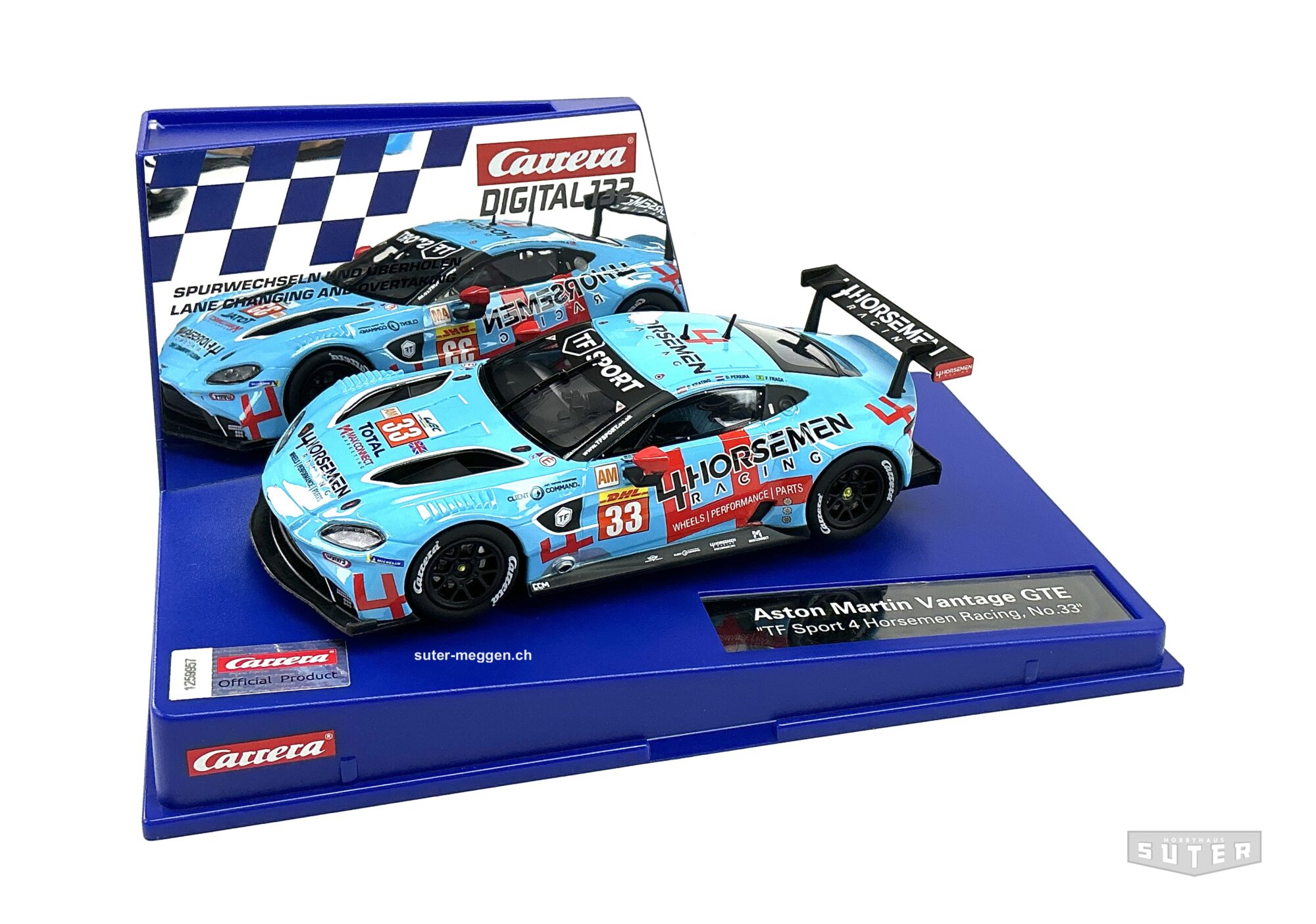 Der Aston Martin Vantage GTE "TF Sport 4 Horsemen Racing, No. 33" setzt auf einen beeindruckenden Frontsplitter, der die Luft nach unten zum Diffusor leitet und so einen Unterdruck erzeugt. Dadurch hat der Wagen deutlich mehr Abtrieb als sein GT3-Schwestermodell, ohne dabei sein grundlegendes Aussehen zu verändern. Das originalgetreue Modell für die Carrera Rennbahn beeindruckt mit digitaler Steuerung und Front-, Rück- und Bremslicht.